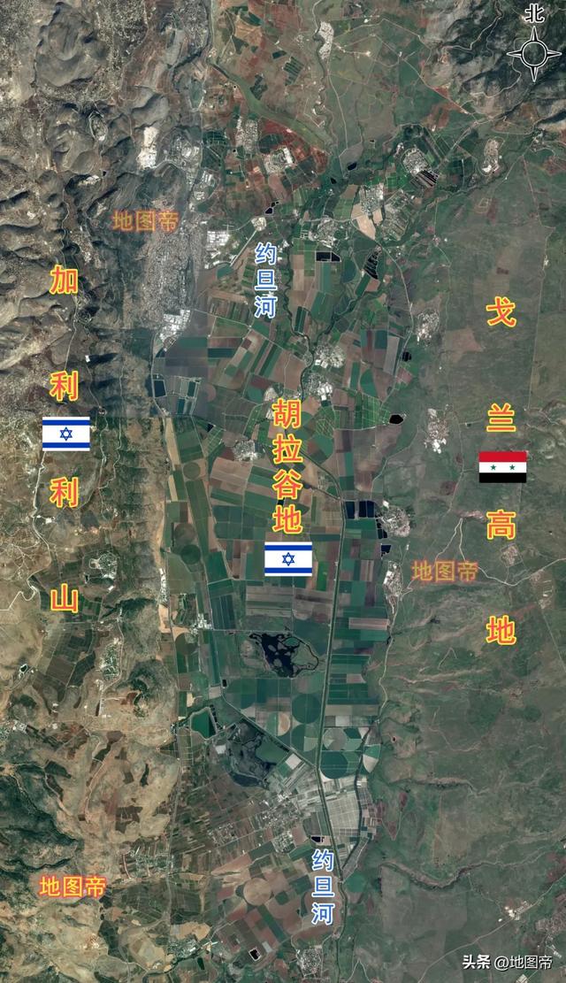 以色列在东北方向,控制叙利亚的戈兰高地,这里南北最长约71千米,中部最宽处约43千米,面积约1200平方千米。