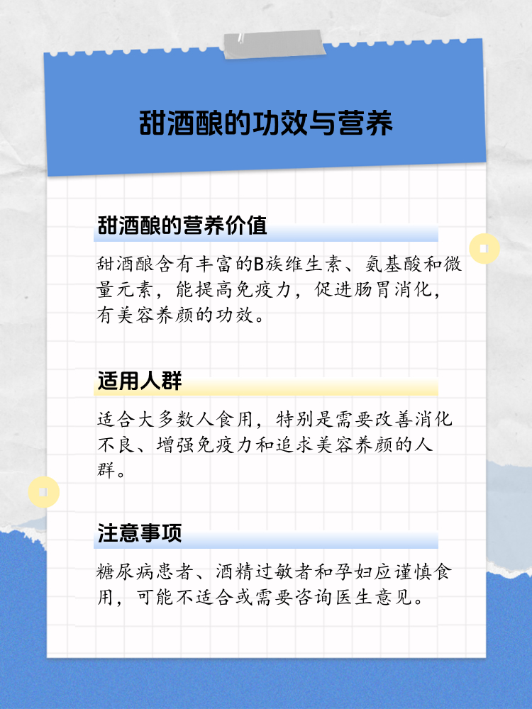 2、醪糟的功效与作用及禁忌如下一醪糟的功效与作用 促进消化醪糟中富含的乙醇成分有助于促进血液循环,进而促进胃液分泌,增加食欲,帮助消化,尤其适合慢性萎缩性胃炎及消化不良的人群调节血脂对于高脂血症及动脉粥样硬化的患者,常喝醪糟可以加快血液循环,提高高密度脂蛋白含量,减少脂类在血管内的;另外经常吃酒酿,可以改善体质,调理月经活血化瘀煮酒酿的时候可以适当加一些配料,比如说桂圆莲子之类的一起食用可以活血化瘀,治疗痛经和宫寒丰胸强心酒酿之所以被称为女性很好的滋补品,是因为其还有丰胸的功效我们可以在煮酒酿的时候往里面打一个蛋,就能起到很好的丰胸作用了另外对于哺乳;醪糟,又称甜酒,是具有一定营养价值的传统饮品它在中国的饮食文化中扮演着重要角色,尤其在一些菜肴的制作中不可或缺下面详细介绍醪糟的功效作用以及相关禁忌一醪糟的营养价值 醪糟含有丰富的碳水化合物蛋白质B族维生素以及矿物质等这些成分对维持人体健康至关重要此外,醪糟中含有的少量乙醇有助于促进血液循环,增强消;一醪糟的好处1 营养丰富醪糟富含多种维生素葡萄糖氨基酸和多肽类物质,能为我们的人体提供丰富的营养2 增强体质醪糟能促进血液循环,适当食用有助于滋补气血,增强体质3 增进食欲醪糟性温,味甘涩,适当食用有很好的增进食欲帮助消化的作用4 保健功能醪糟作为糯米发酵的;1醪糟也叫做甜酒米酒,它的营养价值非常丰富,功效非常广泛从中医角度来讲,醪糟具有补气养血活血化瘀生津止渴的功效,对于一些生产完之后的女性有一定的通经下乳的作用适量的吃一些醪糟可以吸收其中的维生素a维生素b维生素c和大量的氨基酸,从而增强人体的免疫力,起到一定的美容养颜营养神经。