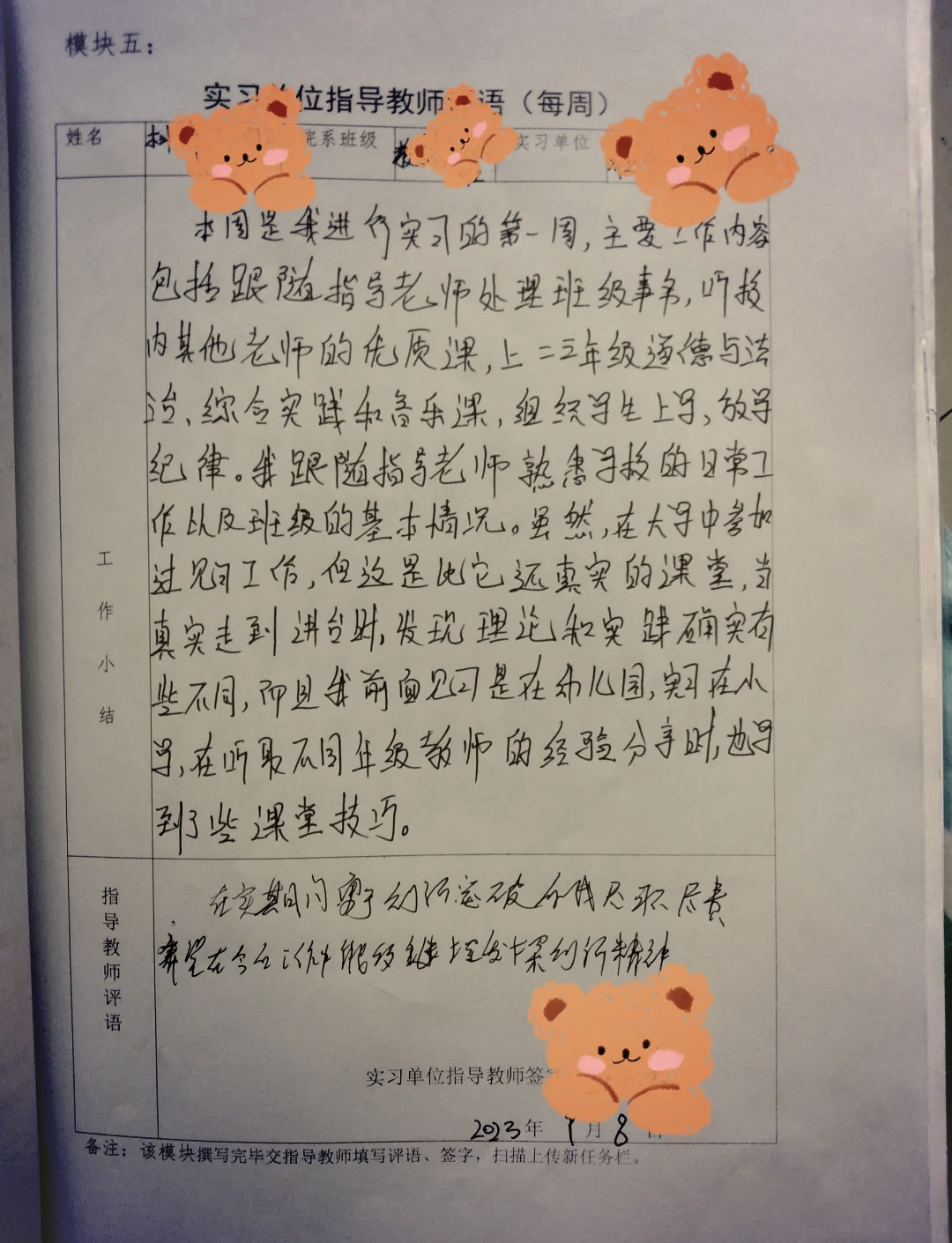 “工作记录”是评价实习指导老师工作的重要依据,因此,要求指导老师务必如实填写填写时需详细记录每一天的工作内容,包括但不限于指导的具体项目实习过程中遇到的问题及其解决情况等具体而言,指导内容部分应详细描述指导老师指导的具体内容,例如技能训练理论讲解案例分析等实习状况则需要记录学生的。
