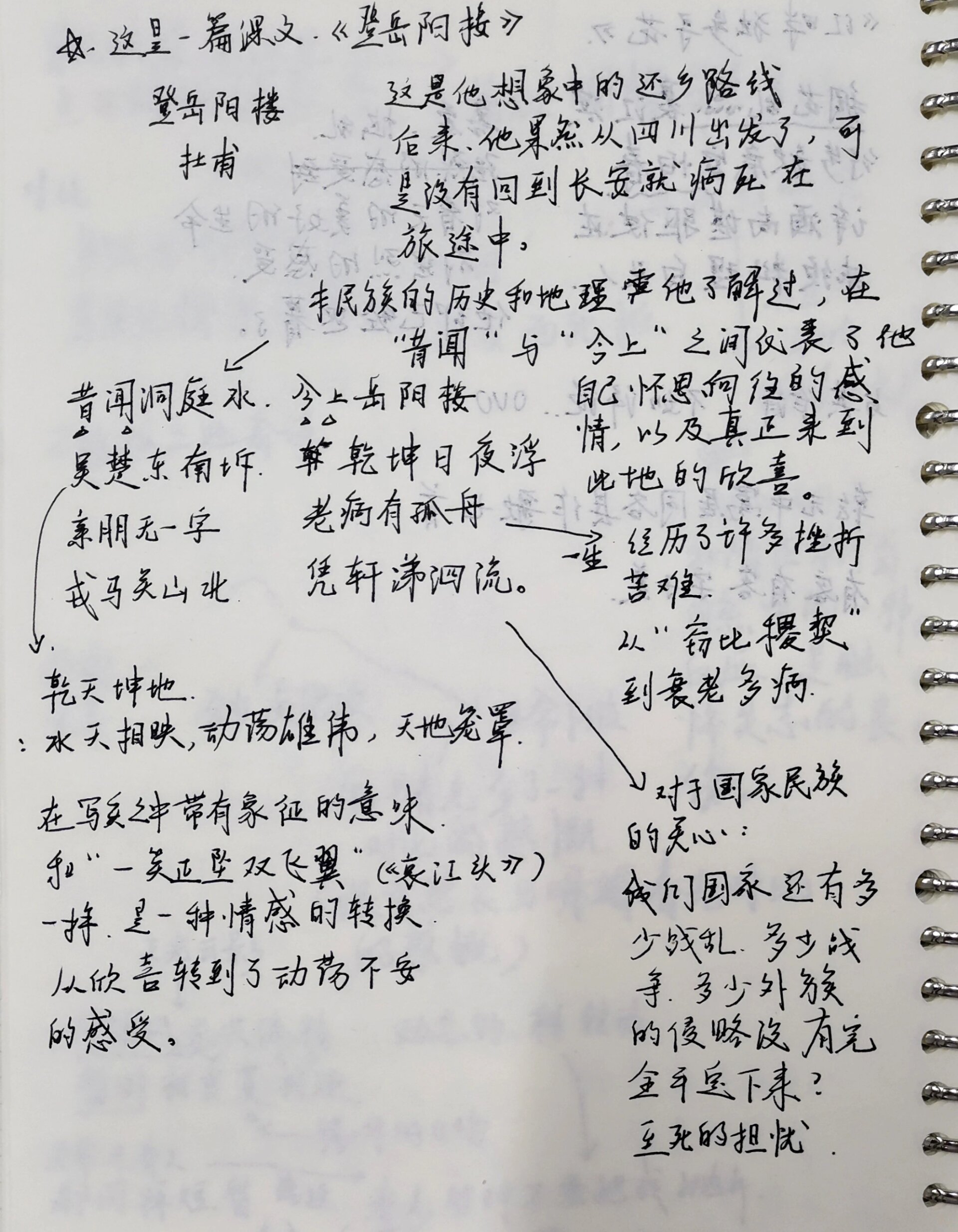 11、登岳阳楼原文如下一登岳阳楼诗歌 登岳阳楼 作者杜甫 昔闻洞庭水,今上岳阳楼吴楚东南坼,乾坤日夜浮亲朋无一字,老病有孤舟戎马关山北,凭轩涕泗流二译文 很早以前就听闻洞庭湖的美景,今天终于有机会登上岳阳楼吴楚两地在我国东南,这里形容洞庭湖广阔无垠,仿佛把吴楚分开。