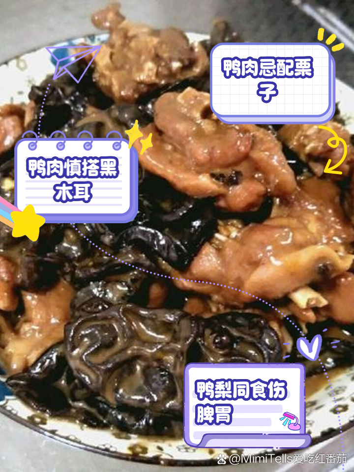 5、1 鸭肉与甲鱼不宜同食,因为两者均为寒性食材,同时食用可能导致身体虚弱,并引发水肿或腹泻等不适症状,对健康不利2 黑木耳与鸭肉搭配也不适宜,同食可能引起消化不良,增加肠胃负担,可能导致腹痛或腹泻,对健康极为不利3 栗子与鸭肉同食也是相克的,两者所含的某些微量元素可能会发生化学。