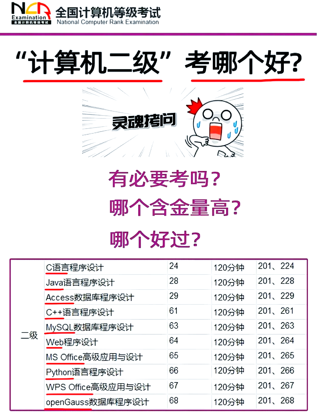 计算机二级考试内容主要包括以下几个部分一编程语言类 C语言程序设计考察考生对C语言基础语法数据类型控制结构函数指针等内容的掌握程度,以及利用C语言进行简单程序设计和调试的能力VB语言程序设计Visual Basic测试考生对VB语言的基本语法控件使用事件处理等方面的理解和应用能力Ja。