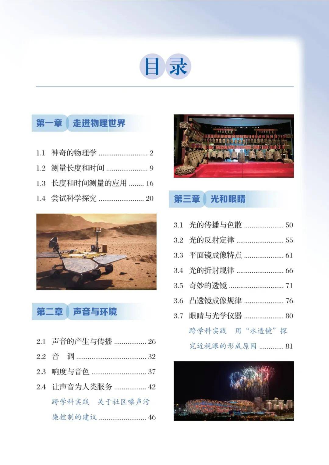 2、初中物理沪科版八年级的目录涵盖了多个物理领域的核心概念第一章,我们打开了物理世界的大门,从基础概念出发,引领学生步入物理学的殿堂随后,第二章带我们走进运动的世界,探讨物体的运动规律及其影响因素第三章则深入声的世界,揭示声音的产生传播和特性紧接着,第四章带我们领略多彩的光,了;2024年最新版沪科版初中物理全套课本由上海科学技术出版社出版,该教材经过了教育部的审核,是一套符合教育标准的初中物理教材该教材注重理论与实践的结合,内容深入浅出,旨在帮助学生掌握物理基础知识,培养科学思维和实验能力二教材目录 一八年级全一册 打开物理世界的大门 走进神奇 探索之路 站;福建初中物理教材主要有两个版本鲁科版和沪科版鲁科版这是人民教育出版社所制定的版本,是福建初中普遍使用的物理教材之一沪科版部分学校会采用上海科技出版社的物理教材,例如福州市的普通初中在2021年就是使用的这一版本值得注意的是,不同城市或学校的具体教材版本可能会有所差异这些教材。