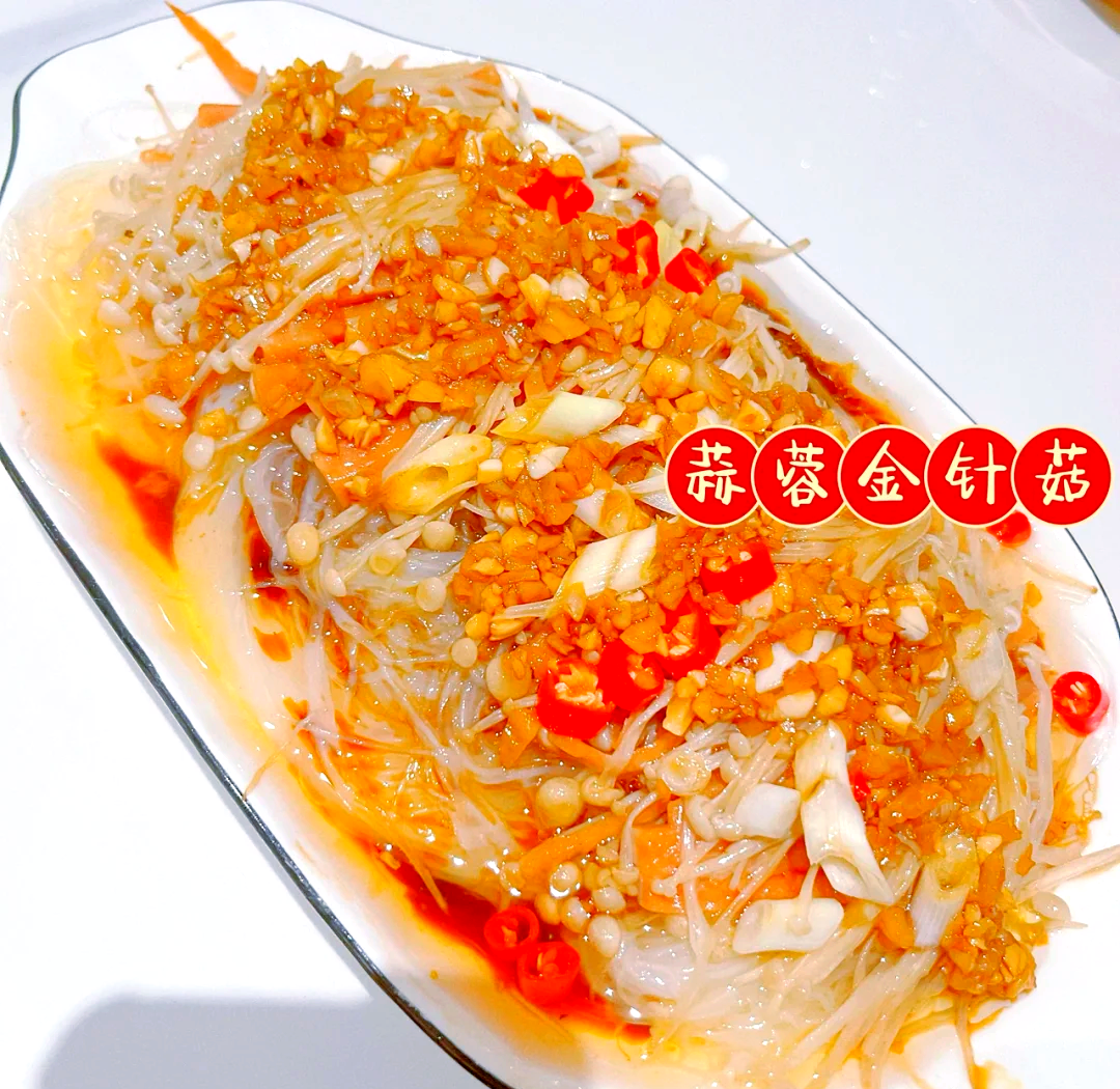 蒜蓉金针菇做法如下食材准备金针菇 1 把蒜 5 瓣小米椒 2 个小葱 1 根生抽 1 勺蚝油 半勺盐 半勺糖 少许制作步骤制作蒜蓉汁锅里倒入适量油,放入切好的蒜末和小米椒碎,小火炒出香味接着加入 1 勺生抽半勺蚝油半勺食盐以及少许白糖,持续翻炒至调料均匀融合,制成蒜蓉汁处理金针菇。