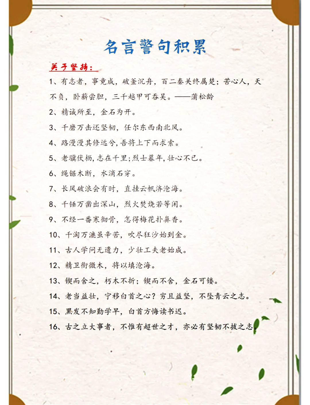答案有志者事竟成,这句话表明了坚定的意志和毅力能够推动人们克服一切困难,最终实现目标破釜沉舟,形象地描绘了为了达成目标,需要舍弃一切后路,全力以赴的决心百二秦关终属楚,意味着只要付出足够的努力,即使面临重重困难,也能攻克难关,实现自己的抱负而苦心人天不负,则鼓励我们在面对困境时,只要肯下苦功,天道酬勤。