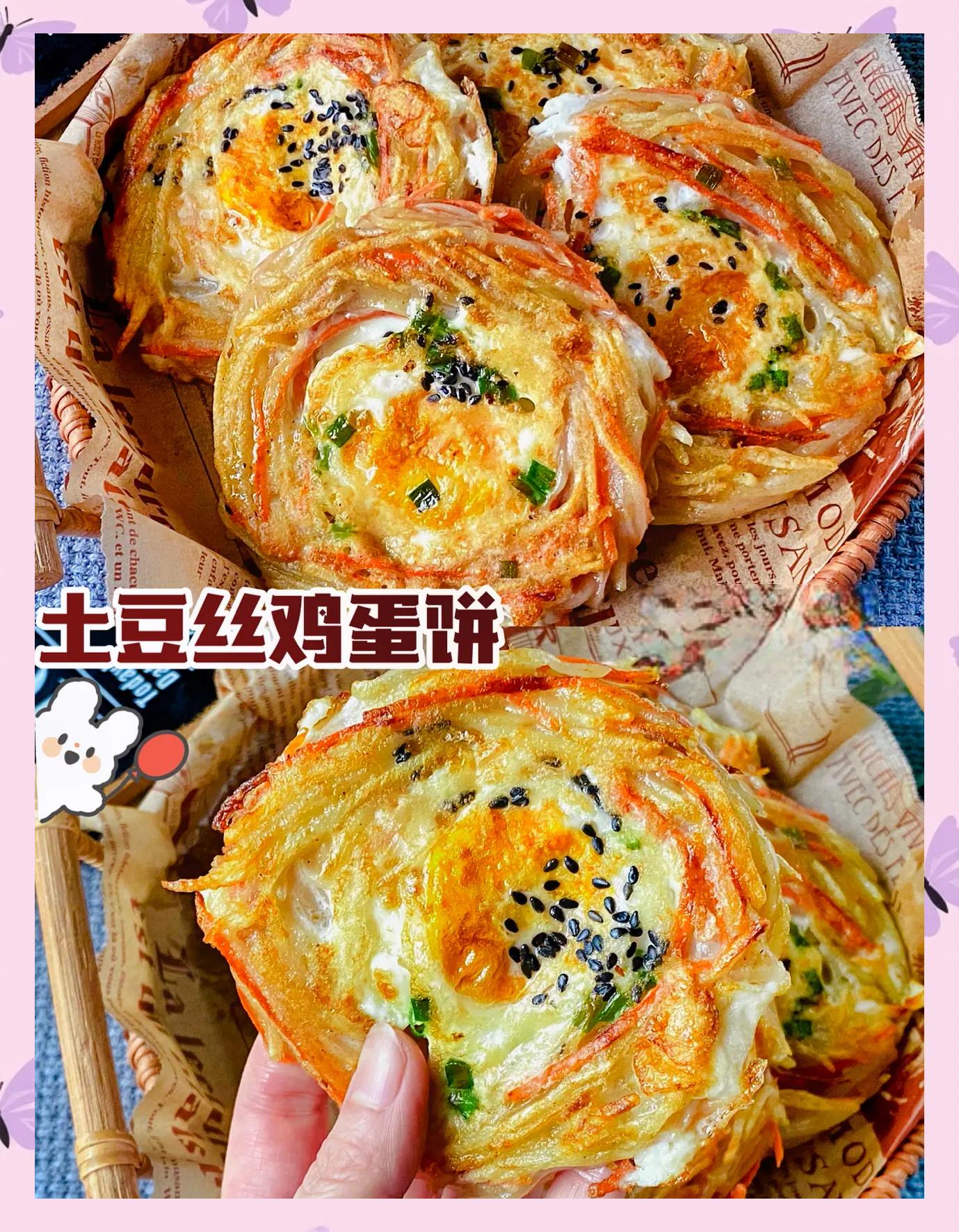 9、土豆丝鸡蛋饼 准备食材土豆2小个胡萝卜半根鸡蛋4颗葱做法1土豆胡萝卜切丝+半勺盐+半勺五香粉+1大勺子面粉+1个鸡蛋搅拌均匀2平底锅加油,土豆丝放入锅中,整理成鸟巢的形状,打入鸡蛋,撒上葱花黑白芝麻,定型后翻面,中火煎熟即可。