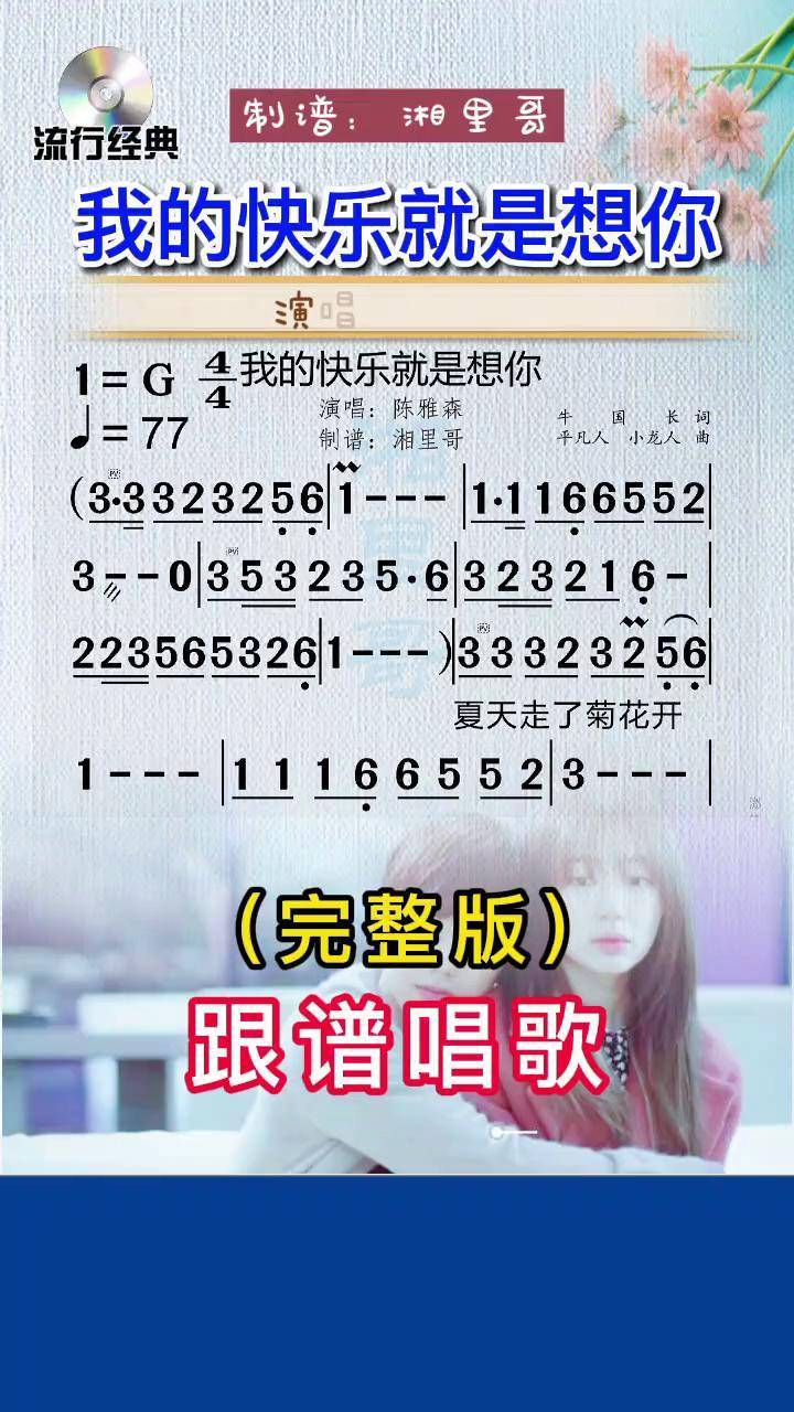 2、1我的快乐就是想你是由牛国长作词,平凡人和小龙女作曲,陈雅森演唱的歌曲,发行于2014年3月27日收录于同名专辑我的快乐就是想你中2歌词 夏天走了 菊花开了 秋风送来 点点的忧虑 阵阵秋雨 敲打着玻璃 片片的落叶 片片愁绪 坐在窗前 翻看日记 字里行间写满都是你 昨日的浪漫 难忘。