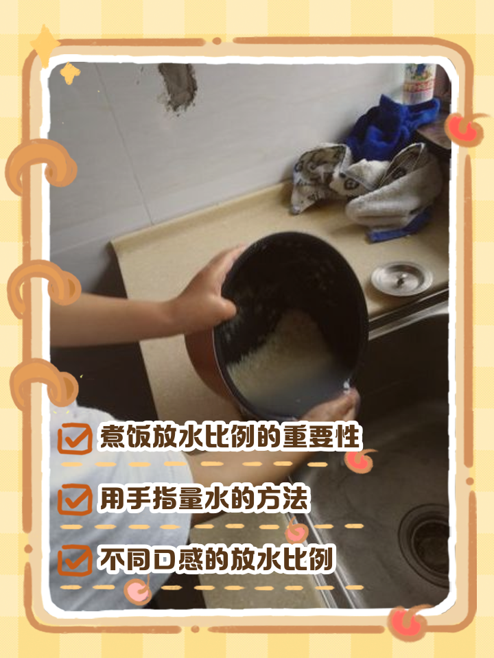 5、一般来说,米饭的水和米的比例是111到112,也就是说,每一杯米需要11到12杯水不过,具体的比例还是要根据不同的米种和个人口味来调整在炊米的时候,可以先将米洗净,然后加入适量的水,用手指测量水的高度,一般来说,水的高度要比米的高度高出12个指节的距离然后将锅盖盖上;电饭锅煮饭放多少水这个一般都是按照人口来进行对比,比如说两个人的话,一般都是放入300ml左右的水和500g的大米如果是一个人吃饭,其实我们就可以放入200ml~300ml的水,但是放水的比例一定要和放米的比例方法1泡米,先把米在冷水里浸泡1个小时这样可以让米粒充分的吸收水分这样蒸出来米饭;蒸米饭的时候,水和米的比例可以控制在121左右,但是水的多少主要取决于米饭的口感如果需要米饭质地更软糯一些的话,可以增加水米比例至151左右,如果想吃口感硬一点的米饭,就要少加点水 抢首赞 评论 分享 举报 为你推荐特别推荐 癌症的治疗费用为何越来越高? 电动车多次降价,品质是否有保障? 什么是“网络厕所”?会造成什么。