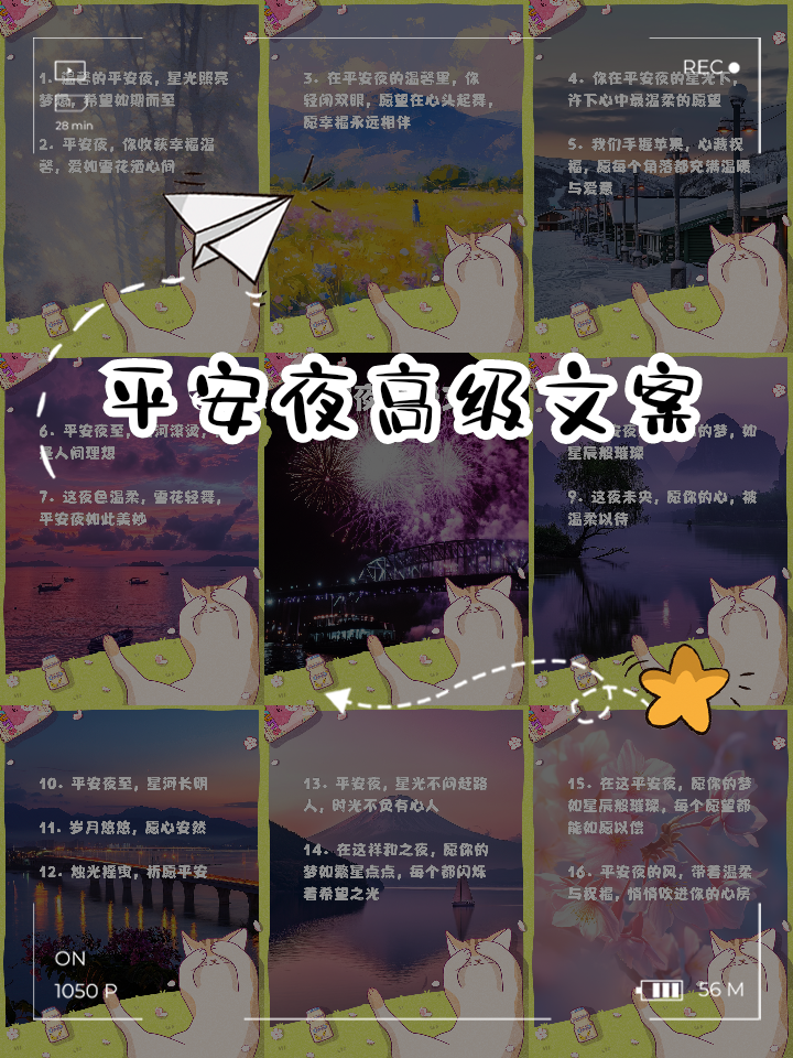1、平安夜小众走心文案 1“平安,愿你平安”2思念的人轻声呢喃“圣诞快乐 喜乐长安 ”3“好想平安夜能下一场雪,雾气糊满窗户,反射着鹅黄的光,然后在午夜十二点,烟囱里落下一个奇迹,奇迹里装着你 ”4“收到过最好的圣诞礼物,是穿越风雪为我而来的你”5“是平安夜是圣诞节,是落叶是初雪,是你喜欢的音。