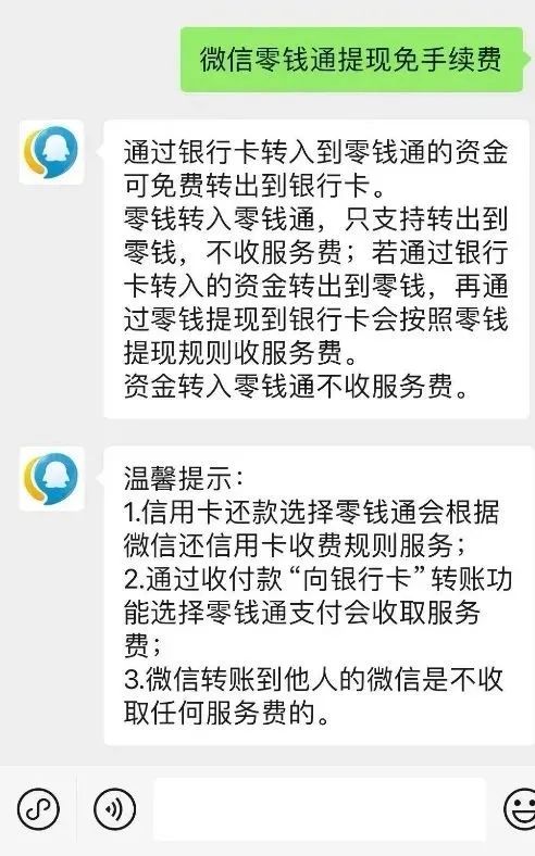 3、微信零钱提现费率为01%,每次最低为01元,也就是每提现100元就会收取01元手续费,假如一次性提现1000元,那么收取的手续费为1元需要注意的是,同一身份证下所有微信号共享终身1000元免费取现额度,在该额度用完之前提现不收费免费额度用完之后,如果零钱余额不高于01元,则提现不收取服务;综上所述,微信零钱提现的手续费标准主要取决于提现金额和提现的银行卡类型在享受完1000元免费提现额度后,普通银行卡提现将按提现金额的01%收取服务费最低01元笔,而提现到民生银行卡则按提现金额的015%收取手续费最低015元笔用户在进行提现操作时,应根据自己的实际情况;*01%=10元如果不想支付提现手续费的话,可以直接从银行卡转入零钱通,零钱通转到银行卡是不收费的,此外也可以使用这些购买。