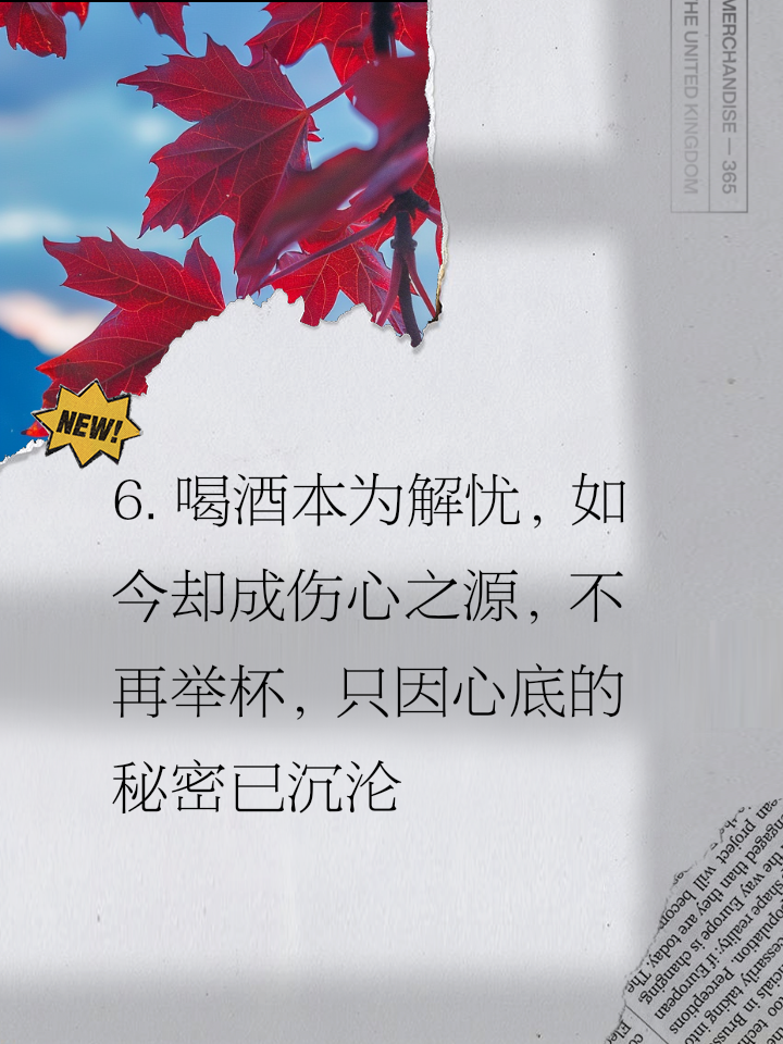 醉酒人生感悟句子如下1 现实与友情的反思 有钱有酒多兄弟,急难何曾见一人这句话深刻揭示了人性中的现实与虚伪,提醒我们在得意时保持清醒,理解真正的友情不是建立在物质之上的2 珍惜当下的美好 草在结它的种子,风在摇它的叶子我们站着,不说话,就十分美好这句话鼓励我们珍惜眼前人。
