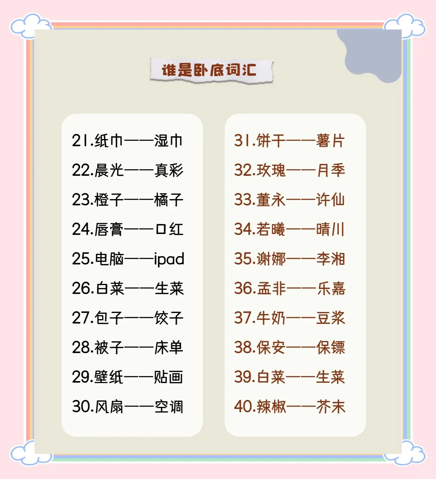 9、卧底劲爆词语橙子橘子,唇膏口红,电脑ipad,动物植物,豆浆牛奶,新年跨年,吉他琵琶,公交地铁,剩女御姐,若曦晴川,谢娜李湘,孟非乐嘉,牛奶豆浆保安保镖,海豚海狮,水盆水桶,森马以纯,烤肉涮肉,气泡水泡。
