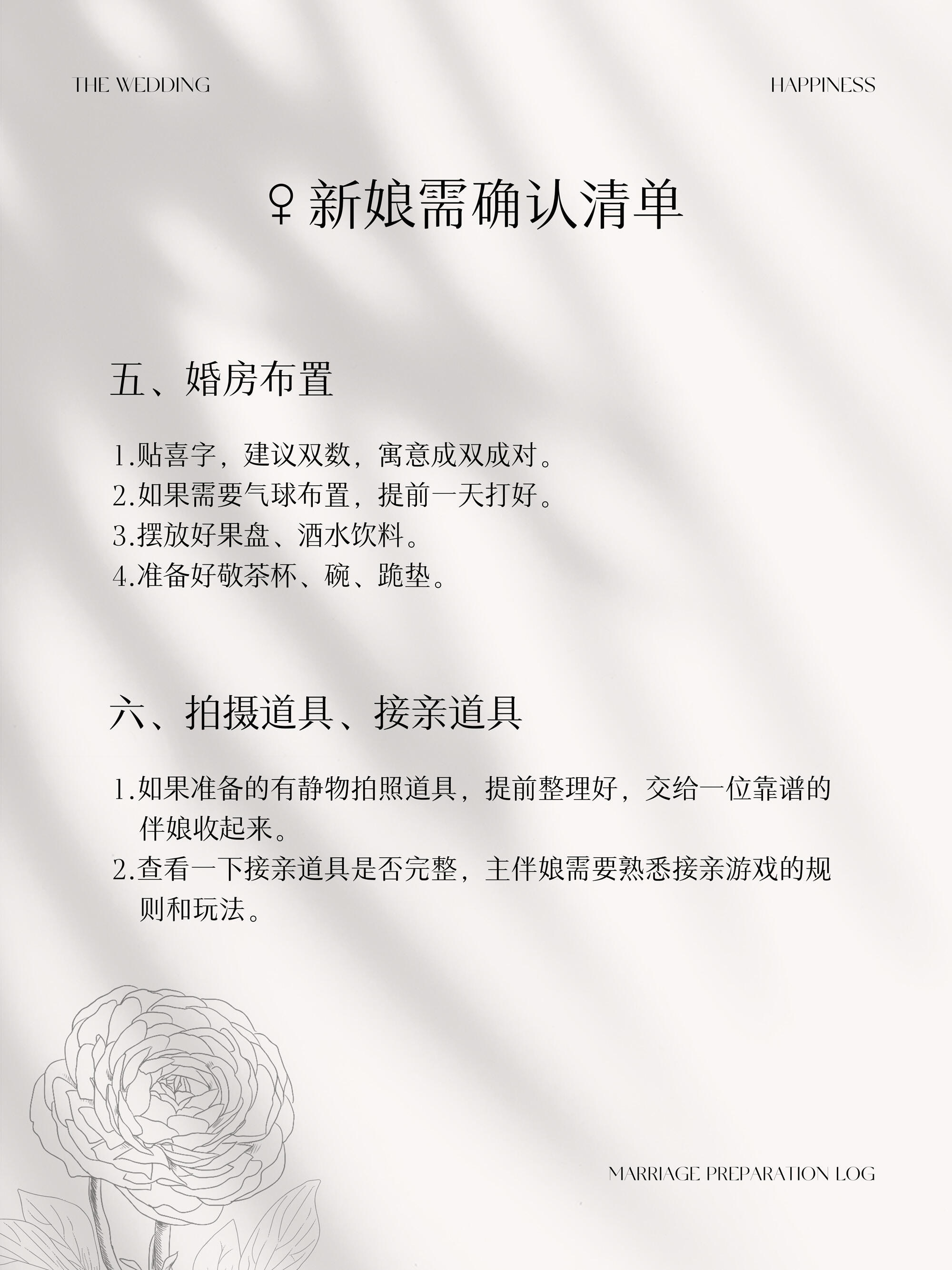 13、2 计算礼金婚礼上,新人会收到众多宾客的礼金因此,婚礼结束后,仔细核算礼金是必要的,以确保宾客的礼金记录无误,为将来回礼提供参考3 闹洞房传统上,新婚之夜会有闹洞房的习惯在享受这独特时刻之前,新人通常要接受朋友们的好玩闹剧结婚当天的禁忌1 避免在夏季使用扇子无论天气。