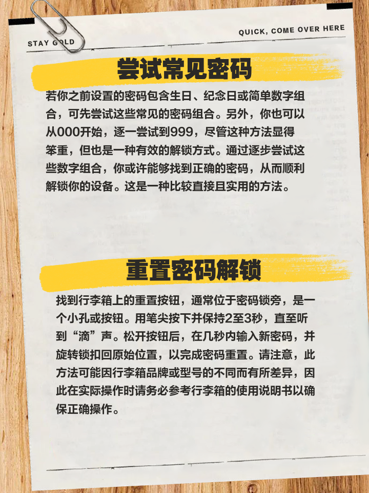 如果您忘记了拉杆箱密码锁的密码,可以尝试以下步骤来恢复出厂密码1 首先,将行李箱的三位数字密码全部重置为零2 然后,用一只手按住按钮,稍微用一点力向开启的方向推,同时用另一只手调整密码的第一位,即离按钮最近的那一位数字,一个数字一个数字地尝试3 当第一位数字调整正确时,按住。