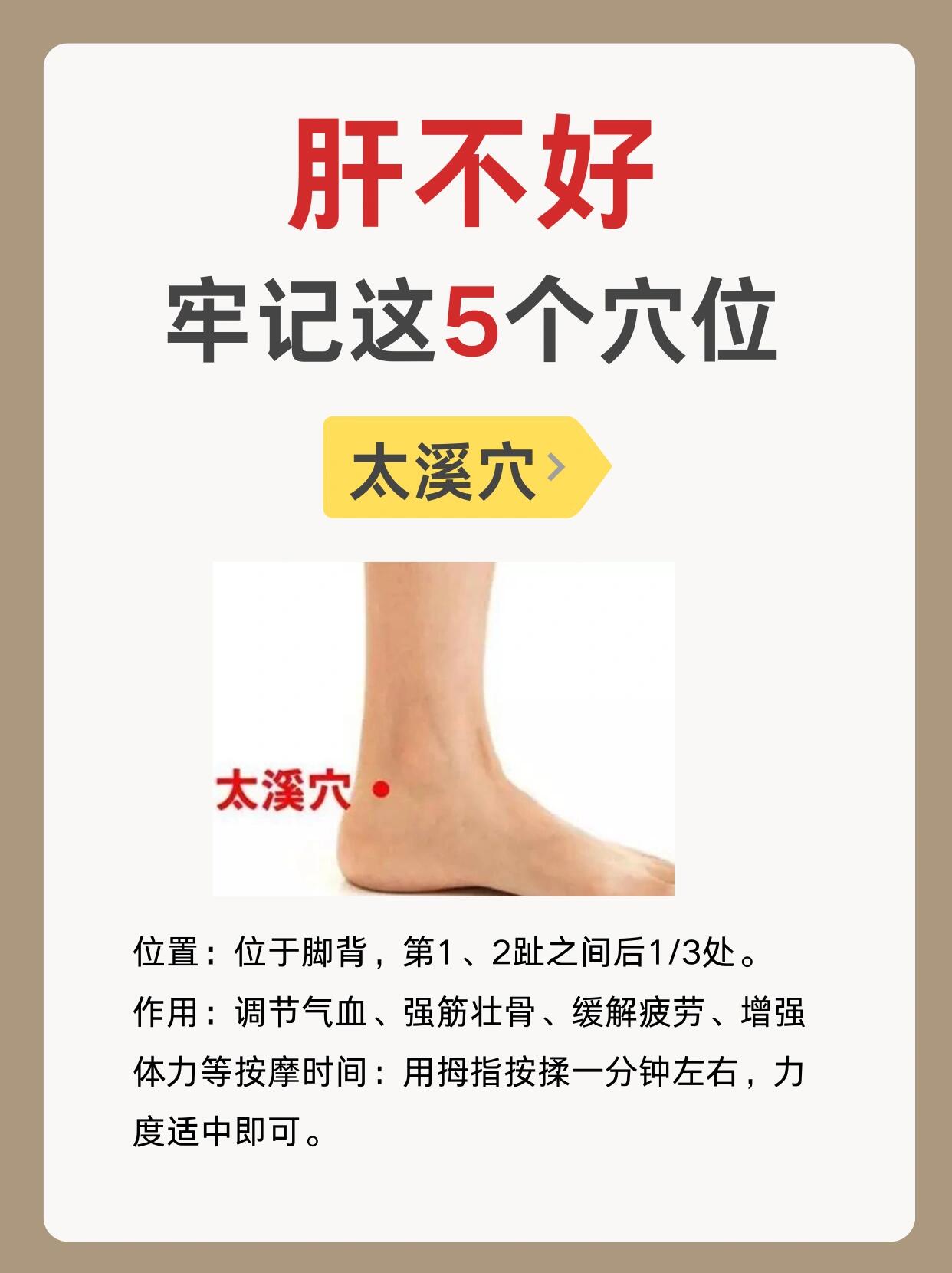 在中医理论中,穴位是人体经络上的特定点,通过刺激这些点可以调节人体的气血运行,达到治疗疾病和保健养生的目的大敦穴太冲穴和行间穴是肝经上的三个重要穴位,对于养肝护肝具有显著效果一大敦穴 位置大敦穴位于大拇趾靠第二趾一侧甲根边缘约二毫米处,即大脚趾内侧的趾甲缝旁边采用正坐;1 神门穴可养心 神门孔横条纹的手腕,小指一侧凹陷可以达到清除心脏和稳定的思想的影响,平时无聊这个设备可以根据区域来刺激穴位,让当地温和酸胀的感觉,每天晚上睡觉前也可以穴位按摩,可以达到安眠的功效中医认为经常按摩五脏六腑,感觉很“滋润”2太冲穴可养肝 太冲穴是肝经上的原穴从中医的角度。