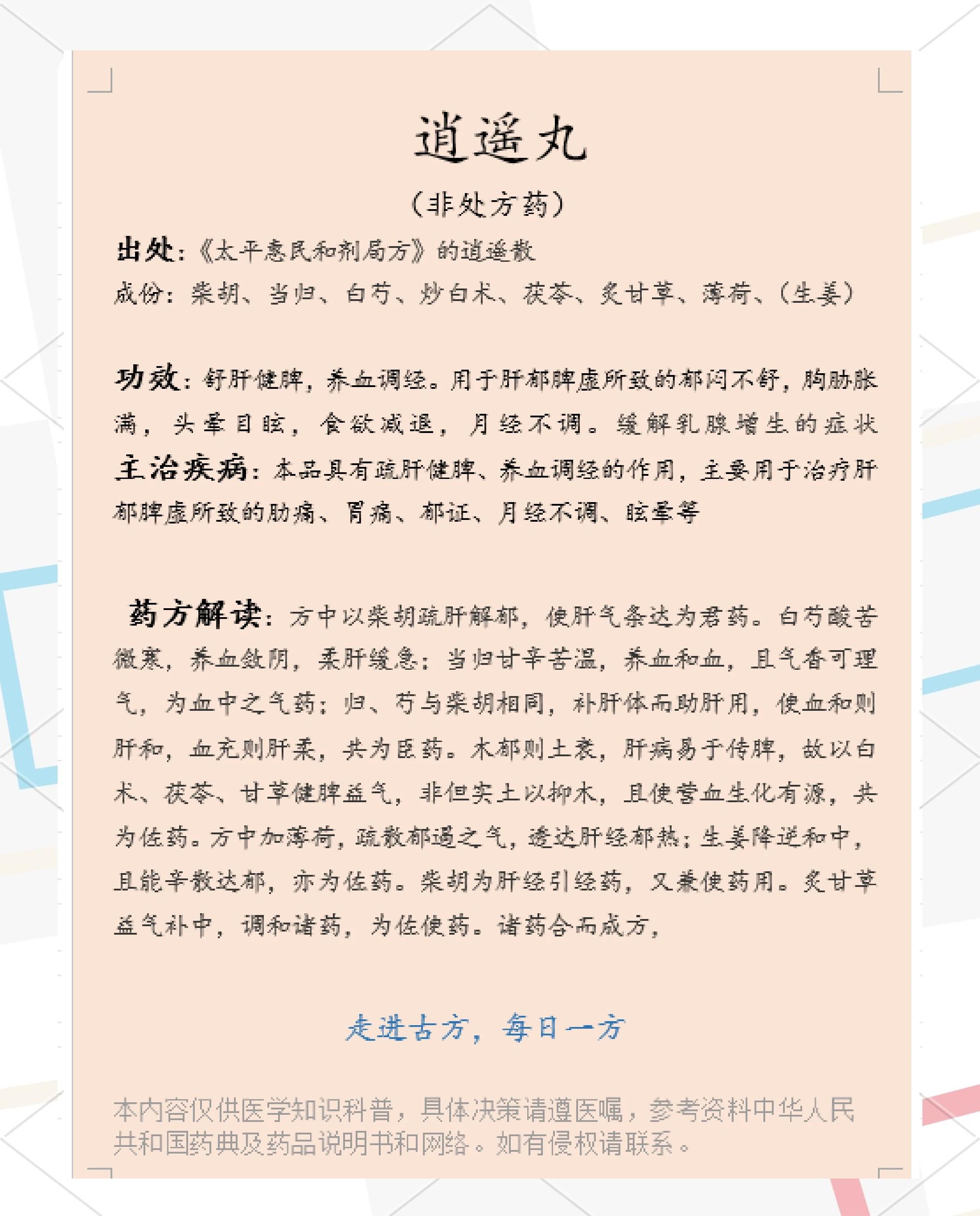 逍遥丸功效疏肝健脾,益气养血调理月经适用症状常用于治疗女性痛经,也可改善因脾虚肝气郁结导致的胸闷气短头晕食欲不佳等症状,无论男女,有上述症状者均可服用舒肝理气丸功效舒肝理气适用症状主要治疗因情绪因素引起的肝气郁结不舒等症状主要成分及作用主要成分包括甘松柴胡和延胡索;舒肝理气丸的功效与作用主要包括以下几点疏肝理气舒肝理气丸的主要功效是疏肝理气,能够缓解因肝气郁结而引起的不适症状解郁该药物还具有解郁的作用,对于情绪不畅心情抑郁等症状有一定的改善效果缓解胸肋胀满舒肝理气丸适用于胸肋胀满的症状,能够帮助患者缓解胸部和肋骨区域的胀满感改善气郁不舒对于因气机不畅;舒肝理气丸,作为一种中药方剂,不仅能有效调理身体,对胸闷气短等症状也有显著疗效对于经常出现腹部胀痛等不适感的朋友,舒肝理气丸同样是一个理想的选择舒肝理气丸的功效与作用 1健脾胃,止咳化痰 舒肝理气丸的主要成分包括山楂果和紫丹参等,这些成分能有效促进胃肠道蠕动,改善消化功能,尤其对于;舒肝理气丸的药方由11味药组成,其中柴胡和香附是主药,具有疏肝解郁和理气止痛的功效青木香玫瑰花和延胡索能够行气解郁陈皮则起到理气调中的作用此外,药物中还包含半夏,它具有降逆止呕和消痞散结的功能山楂帮助消食化积丹参有助于活血行气广藿香能够化湿止呕甘草作为使药,主要作用;首先,婴幼儿由于身体耐受力较差,使用疏肝理气丸可能会损伤正气对于婴幼儿,应选择专为儿童设计的治疗药物,而非随意使用成人药物,即使减少剂量也不适宜其次,老年人应避免使用此药,因为老年人身体机能较差,基础疾病多,内环境相对较弱疏肝理气丸的强力理气作用可能导致正气受损体弱者也应谨慎使用;舒肝理气丸主要用于治疗肝郁气滞相关疾病,对湿气重无直接治疗作用,但可能辅助改善部分相关症状舒肝理气丸由青木香姜半夏陈皮延胡索玫瑰山楂香附柴胡丹参甘草广藿香等成分组成,核心功效为舒肝理气解郁,临床常用于肝郁气滞引发的多种疾病,如神经衰弱焦虑症更年期综合征及肝胆疾病。