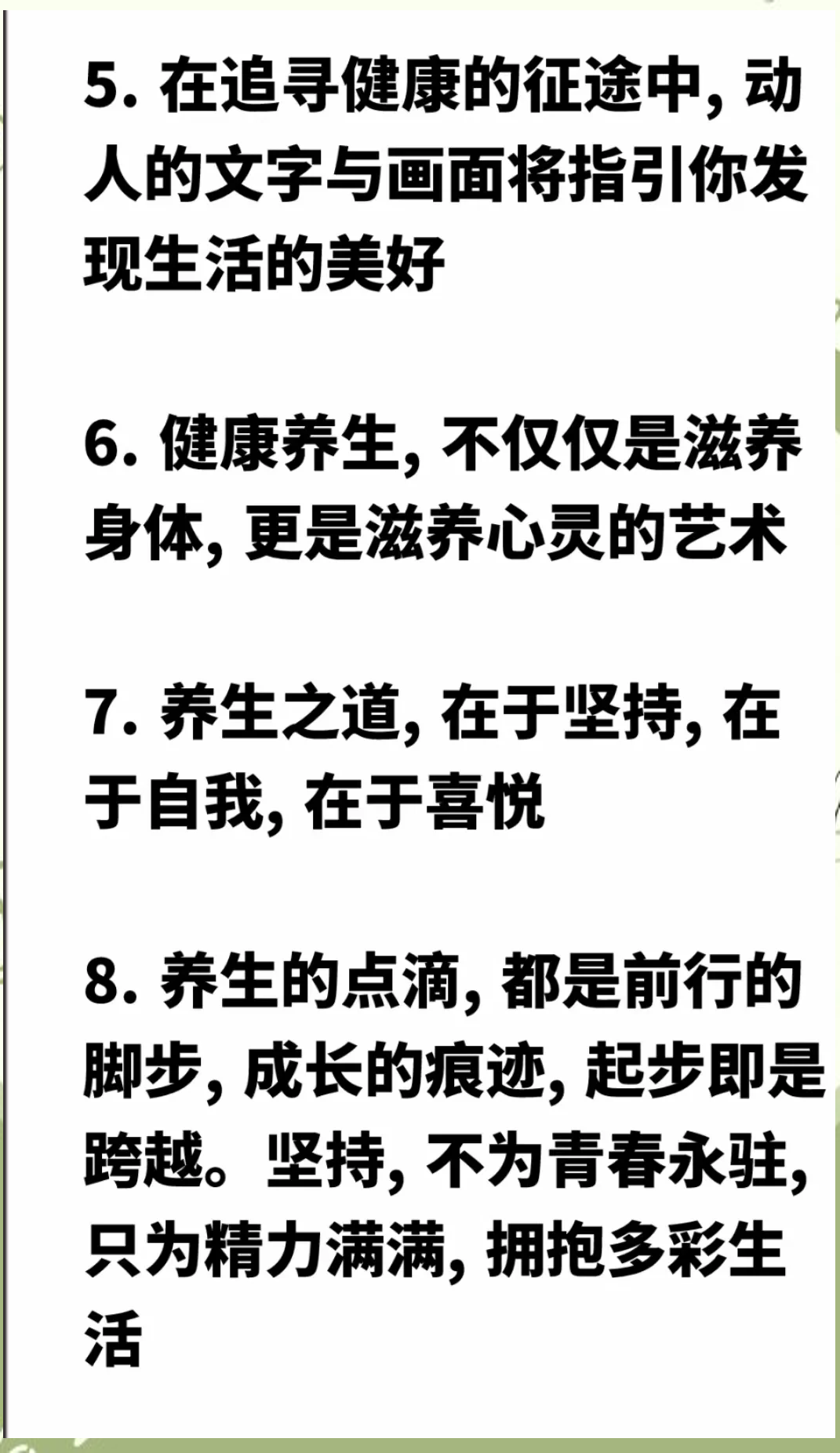 4人生短暂,健康最重要珍惜身体,关爱自己5健康就像储蓄,只有平时多积累,才能拥有足够的本钱去应对未来的挑战6不要等到身体出现问题时,才意识到健康的重要性从现在开始,珍惜自己的身体7健康的生活方式,不仅能让我们的身体更健康,还能让我们的心情更愉悦,生活更有质量8健康是无价之宝,我们要好好。