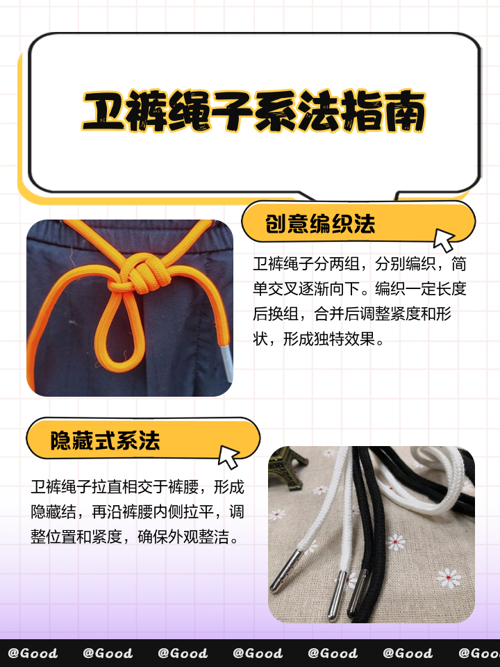 一快速止滑技巧防脱扣结选裤子腰部松紧绳,左手捏住两端交叉处,右手将两端同步绕食指转两圈形成螺旋状两端穿过形成的圆环后拉紧,形成的“8”字结既隐形又能防止日常活动导致绳头脱落二进阶解决方案组合1材质优化用细砂纸轻轻打磨绳子两端增加摩擦力,或用打火机轻微灼烧绳头防止散线2。