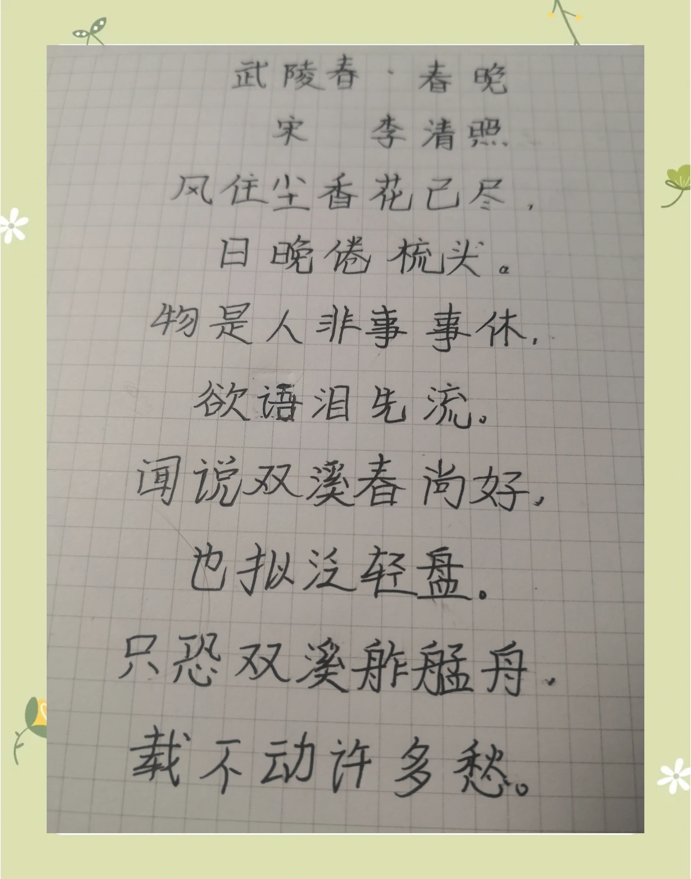 作这首词的时候,李清照已经遭遇了靖康之耻,衣冠南渡,以及赵明诚的因病去世,遭受多重打击的李清照此时一个人孤苦伶仃其它还好,没有爱情滋润的李清照纵使在诗词方面取得了伟大的进步,奈何余生怎生得过“怎一个愁字了得”8武陵春·风住尘香花已尽风住尘香花已尽,日晚倦梳头物是人。