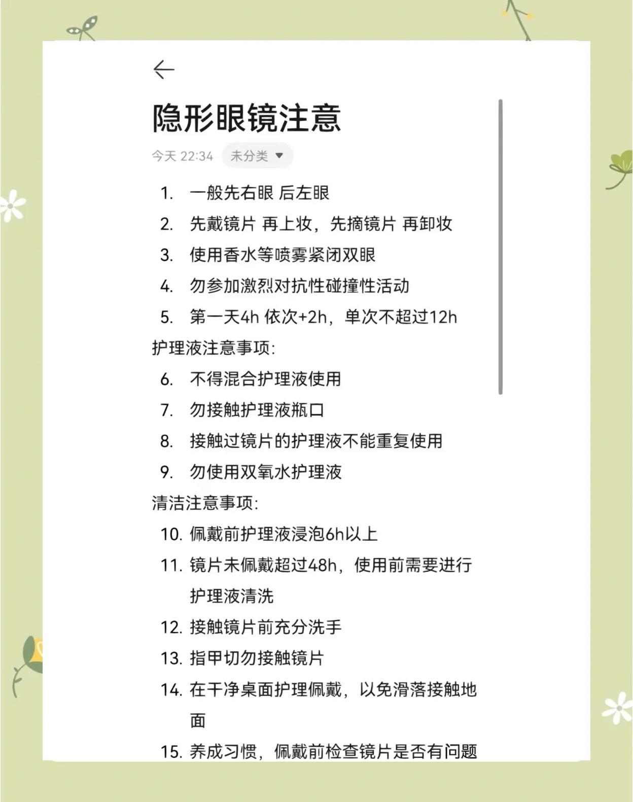 3、隐形眼镜的佩戴方法分为佩戴前准备佩戴操作及注意事项三部分,具体如下一佩戴前准备工作镜片浸泡 新隐形眼镜日抛除外需用护理液浸泡4~8小时,年抛镜片需浸泡8小时以上日抛镜片无需浸泡,但首次佩戴隐形眼镜不建议选择日抛手部清洁 佩戴前需用洗手液彻底清洁双手,并用无毛絮毛巾擦干,确保手上无水分残留环境与工具准备;佩戴隐形眼镜需按准备佩戴佩戴后注意事项三个阶段规范操作一佩戴前准备清洁双手用肥皂彻底洗净双手,去除油污灰尘等杂质,防止污染镜片引发眼部感染儿童需由家长协助完成清洁,培养卫生习惯检查镜片取出镜片后,通过透光观察其完整性,确认无破损粘连等问题若发现异常,需立即更换新镜片;方法一指腹法用左手食指或中指固定上眼睑,右手食指托住镜片,轻轻靠近眼球当镜片接触眼球时,不要立即闭眼或松手,保持23秒让镜片吸附缓慢松开眼睑,轻轻转动眼球,使镜片贴合更自然方法二辅助工具法使用隐形眼镜专用小镊子夹取镜片需确保镊子清洁,按上述步骤放置关键细节 佩戴;隐形眼镜的正确佩戴方法如下区分镜片的正反面将隐形眼镜轻放在指尖,观察其边缘形状正面边缘呈碗口状的正圆形反面边缘向外翘起准备佩戴用右手的食指指尖轻托住隐形眼镜,确保镜片正面朝上佩戴过程双眼注视前方,双手中指分别拉开上下眼睑将镜片附着于角膜中央,然后移开食指往下看以使。