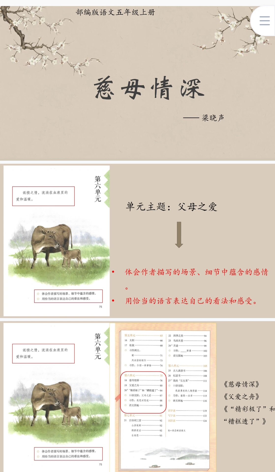 的感人画面,让读者体会到了“深刻深厚深沉”的“慈母情深”文章描写细腻,情感真挚,语言浅显易懂让我看到了一位舐犊情深,勤劳温柔的母亲作者在小说中记叙了母亲在极其艰难的生活条件下,省吃俭用,支持和鼓励“我”读课外书的往事,表现了慈母对子女的深情,以及孩子对母亲的敬爱之情。
