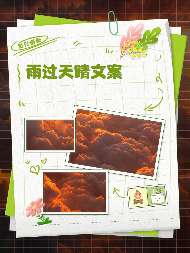 7、雨过天晴,柳暗花明,时来运转,否极泰来,每一次的雨后都预示着新的开始享受回忆,珍惜现在,畅想未来,雨后必是晴天,这是生活的美好定律天空那么美,云朵那么温柔,雨后总会晴天,而你,总会有人疼爱时光里,时雨时晴才更加精彩,只要心中的那朵花永远灿烂,雨后定能迎来最美的晴天画卷风雨。