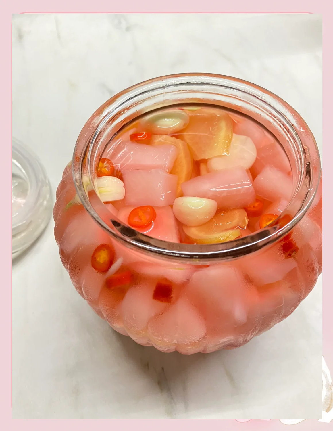 14、确保红醋完全覆盖萝卜片和白糖密封冷藏封上坛子的盖子,确保密封良好,以防止醋味溢出将坛子放入冰箱冷藏等待食用第二天,浙醋泡白萝卜即可食用注意检查坛子的密封性,防止醋味进入冰箱影响其他食物按照以上步骤操作,你就可以成功制作出使用红醋泡制的浙醋白萝卜了。