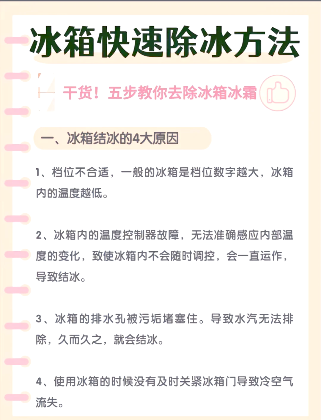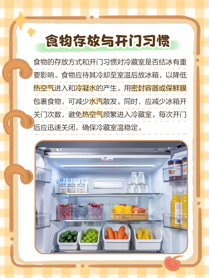 2、1 咖啡渣咖啡渣具有一定的吸湿作用将干燥的咖啡渣用纱布包起来,放在冰箱冷藏室和冷冻室的角落它能吸收空气中多余的水分,减少水汽遇冷结冰的可能性,从而在一定程度上缓解冰箱结冰问题2 竹炭包竹炭有强大的吸附性能把竹炭包放置在冰箱内,它可以吸附冰箱中的异味和湿气湿气被吸附后,冰;对尚未脱落的冰块,可用手轻扳如果冷冻室顶部没有金属蒸发板,盛开水的饭盒应上盖,以免低温下的塑料内壁因骤然升温而变形4借助外风切断冰箱电源,拿出冰箱里的物品,用吹风机或电风扇慢慢把冰吹化,并在冰箱最底层辅上毛巾吸水,经过风吹,霜层会融化得非常快,如此再清理时更容易;硅胶干燥剂和活性炭包可吸附空气中的湿气,将未开封的它们放入冰箱冷藏室或冷冻室,能降低冰箱内湿度,从源头减少结冰条件,但需定期更换以保持效果此外,保鲜膜保鲜袋虽不是不会结冰的物品,但有防结冰作用先清洁冰箱搁板可用白醋擦拭杀菌,再用保鲜膜包裹搁板或在易结冰区域覆盖保鲜袋也可在。