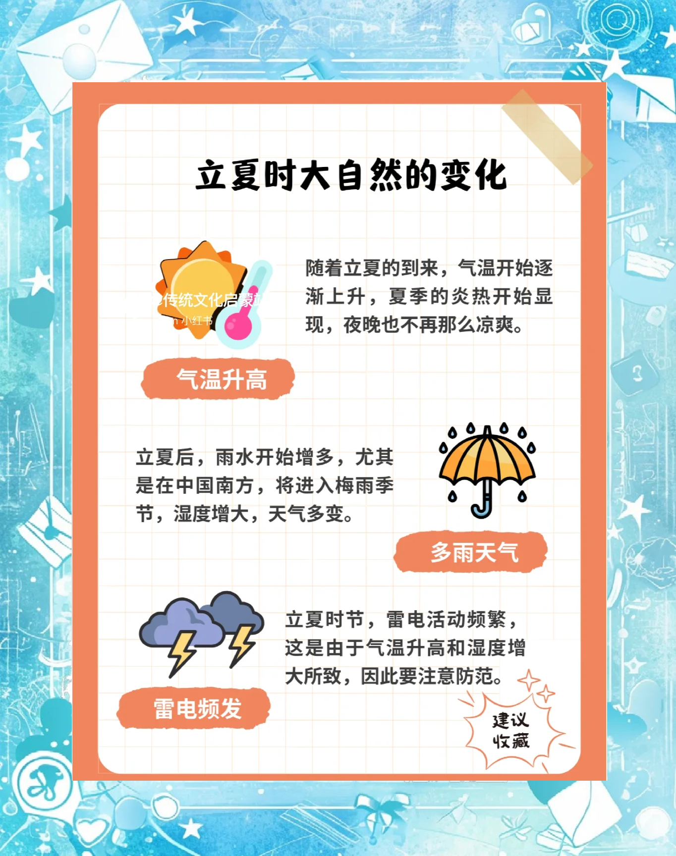 立夏代表着日照时长慢慢增加,太阳公公开始更加勤奋地照耀着大地啦立夏意味着雷雨天气频繁出现,天空可能会变得时而晴朗时而阴沉,雷公公和电婆婆也会时不时地来串门立夏象征着气温稳步上升,我们正式和凉爽的春天说拜拜,迎来炎炎夏日,可以穿上轻便的衣服,感受夏日的热情立夏是农作物茁壮生长的时节;立夏节气的含义是告别春天,夏天即将开始,标志万物进入生长旺季具体来说季节转换立夏是夏季的第一个节气,表示春季已经结束,夏季即将正式开始生长旺季这一节气标志着自然界万物进入旺盛的生长阶段,农作物开始茁壮成长天文特征立夏交节时间在每年公历5月5日至7日之间,此时北斗七星的斗柄指向。