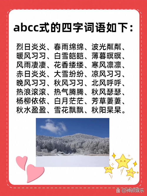 abcc式的四字词语如下1喜气洋洋形容非常高兴愉快的神情汉语成语拼音是xǐ qì yáng yáng意思是充满了欢喜的神色或气氛出自岳阳楼记2小心翼翼形容非常谨慎小心,不敢有丝毫大意原形容严肃虔敬的样子,现用来形容言行举动十分谨慎,丝毫不敢疏忽大意3风度翩翩形容举止。