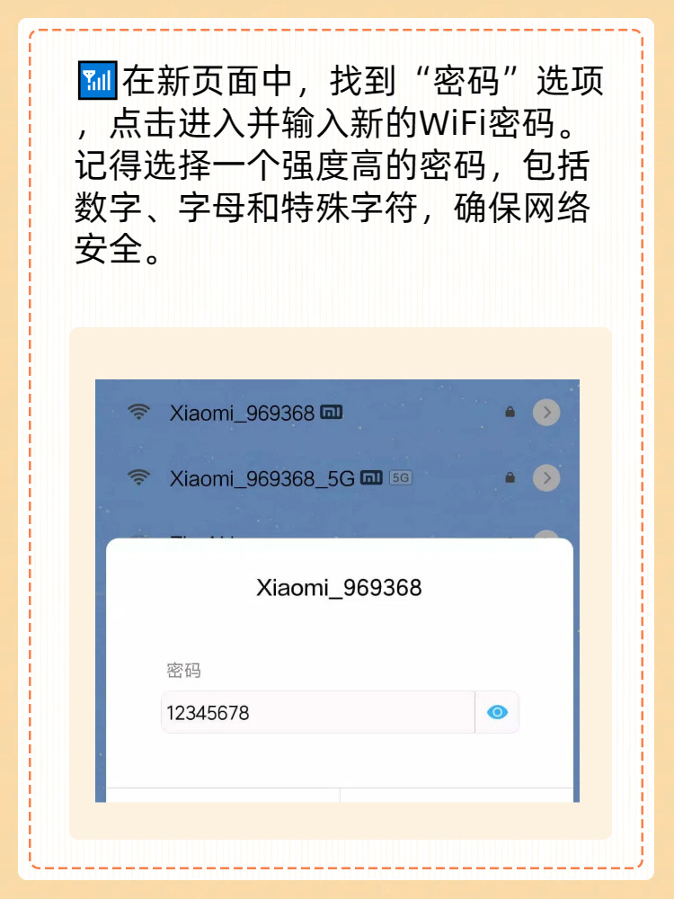 方法一通过路由器管理界面修改连接WiFi要保证手机已连接到需要修改密码的WiFi网络访问管理界面打开手机浏览器,输入路由器默认IP地址,通常是或,可在路由器底部标签查看登录路由器输入默认用户名和密码,大多为admin,具体可查看路由器标签修改密码进入“无线设置。