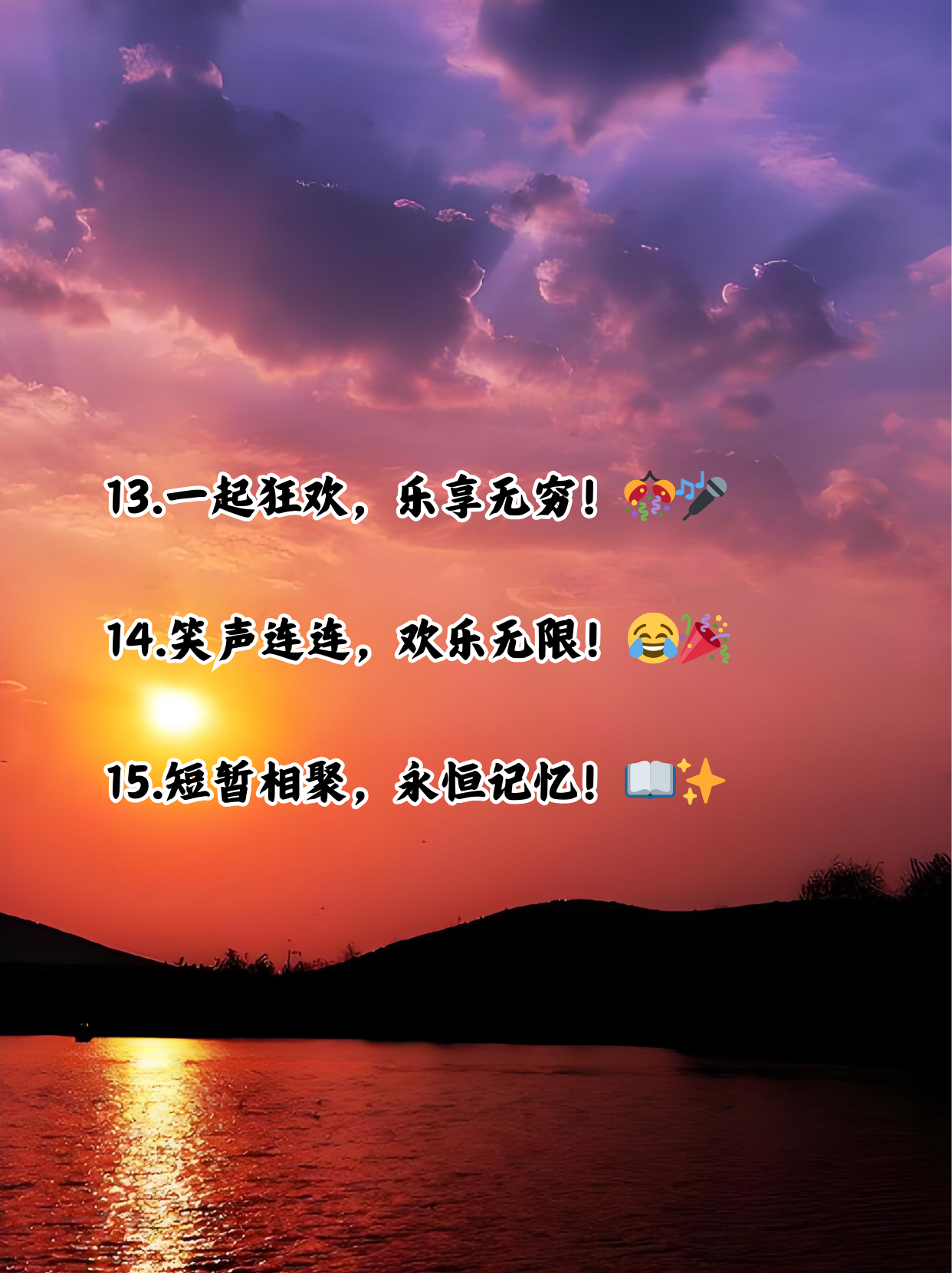 昼夜往返,各自安好,我们却没有来日方长其实真正幸福的标准,无需理由很简单,只要笑容比眼泪多,你就算找对人了心疼是相互的,只有一个人的努力,改变不了两个人的关系对于那些无动于衷不懂珍惜的人,转身离开吧;适合游山玩水旅行时发朋友圈的精美文案适合姐妹聚会时发朋友圈的文案点个“赞”与“在看”给我一点坚持更新的动力叭;适合姐妹聚会发朋友圈的精美句子,小编整理的这些一起来看看吧!1 中午还是熟悉的烤肉,晚上还是熟悉的火锅,万里相聚,终有。