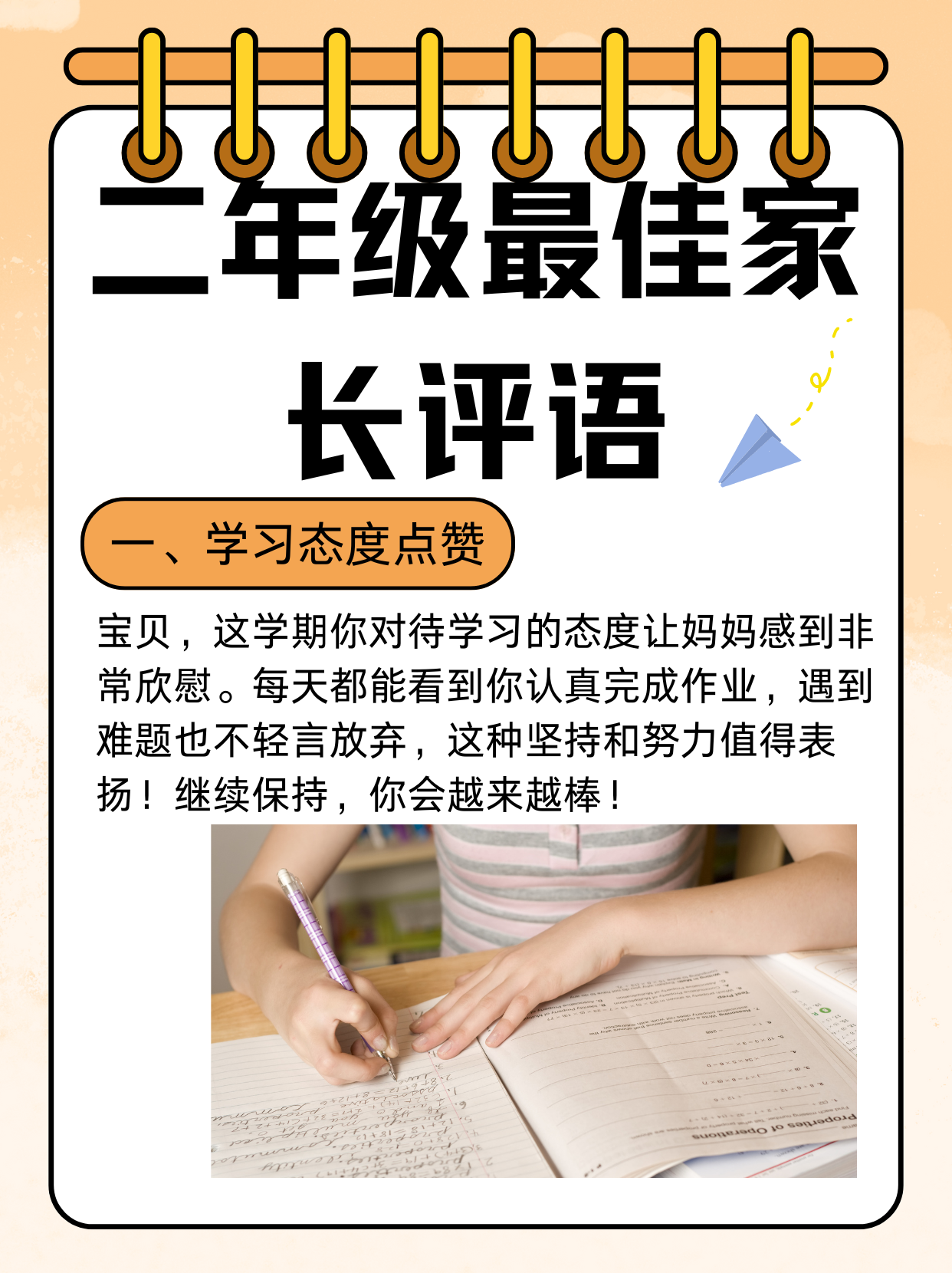 家长评价在教育领域中扮演着非常重要的角色优秀的家长评价能激发学生对知识的兴趣和热情,并鼓励他们取得更多的成就 下面是一些家长评语分享 1你的进步真不小,可要珍惜取得的成绩啊! 2学习上你进步很大,妈妈坚信成功属于你! 3妈妈希望你能把精力多花在学习上! 4希望你以后能认真听课,使成绩更进一。