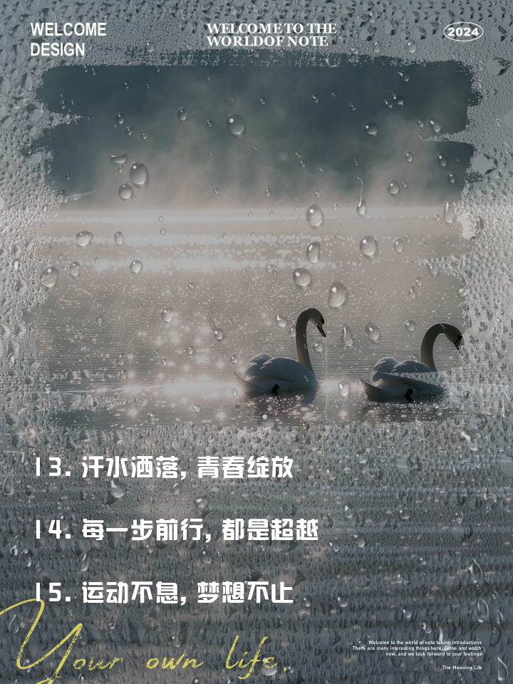 7、1压抑久了,就释放一下2运动,情绪治愈之良药3丰收靠劳动,强身靠运动4丰收靠勤劳,身强靠锻炼5天天练长跑,年老变年少6少壮不锻炼,老来徒伤悲7早起活活腰,一天精神好8时间是生命,动作是性命9练出一身汗,小病不用看10跑步是治疗抑郁症的良方11。