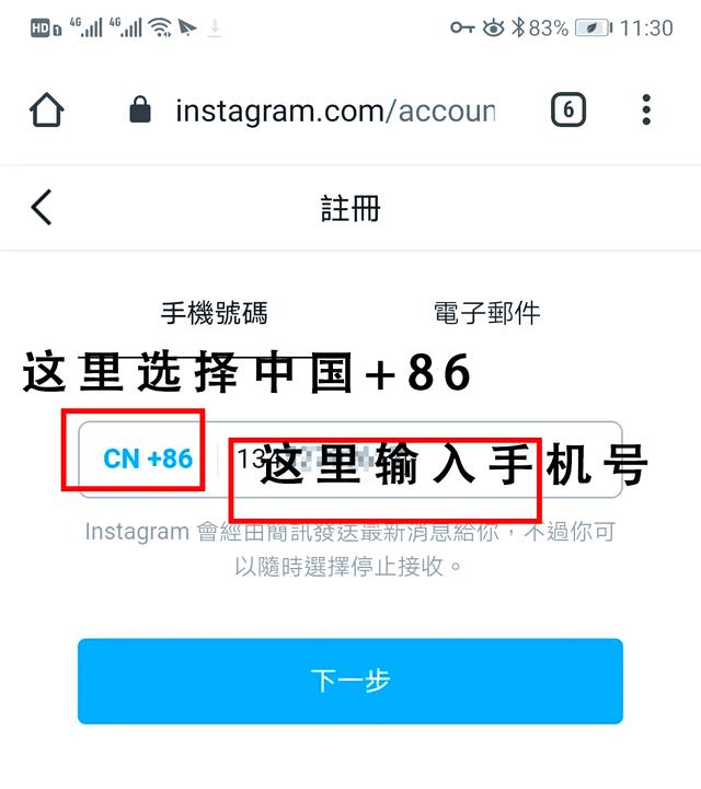 3、使用安卓手机里的浏览器,打开 instagramcom点击蓝色按钮“使用邮箱或者手机号注册”填写手机号或者邮箱,如果用手机号,那么前要选择 +86如果用的是邮箱,要检查下填写的是否正确,以后验证时可能需要邮箱填写账号和密码,账号可以填写长一些,要不然可能会和别人的重复跳过绑定Facebook,或者你可以。