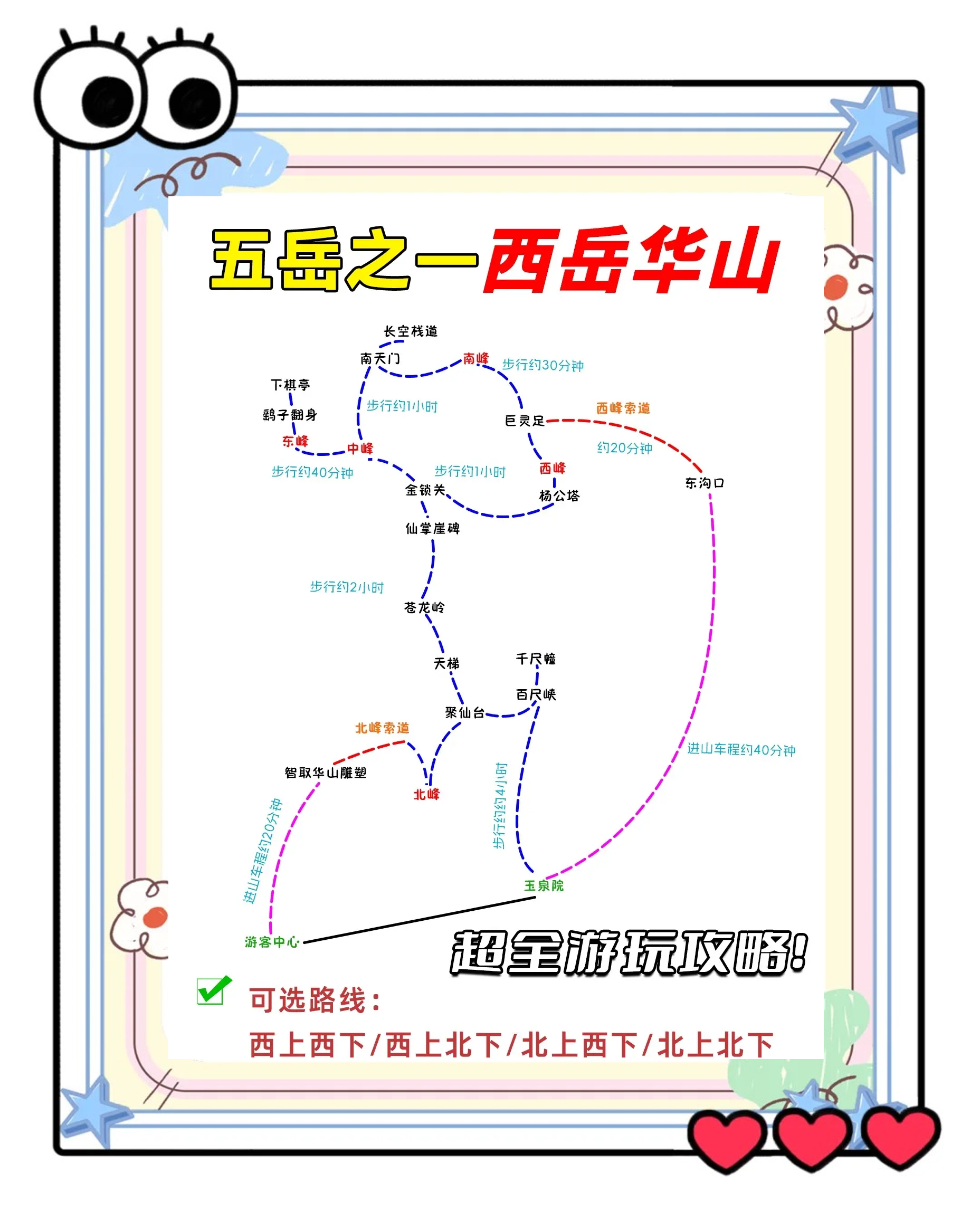 3、华山夜爬攻略基于2017年端午前夕经验一行前准备饮水建议携带2瓶矿泉水+1瓶含能量饮料如红牛,总量不宜过多负重爬山消耗体力山上矿泉水价格10元3瓶,饮料越往上越贵食物女性34条士力架巧克力糖,1袋薯片或饼干男性可带干拌面,或在山上花10元买碗面装备;晚上,你可以通过一路从古华山在西线或者智作华山路东线,到达东峰看日出D2早上看完日出,游览了东风南峰西峰吴云峰中峰北峰后,可以坐索道三专列或者从知止华山路步行下山到瓦庙沟,再乘车上山,也可以坐华山古道去山上然后回来3参考路线3白天参观主峰,晚上住山脚D1到达景区后,游客从新;华山旅游攻略 华山以险峻著称,是五岳之一,夜爬观日出是经典体验以下从交通夜爬路线注意事项三方面整理实用信息一从华山北站到玉泉院的交通方式免费公交+转车出华山北站后左转至华山汽车客运站外右侧,乘坐华阴12路至华阴生态广场终点站,再转乘免费公交至华山游客中心1号停车场,最后步行至;华山位于陕西省渭南市华阴市境内,属秦岭支脉,古称“西岳”,又称“太华山”,为中国著名的五岳之一,中华文明的发祥地,“中华”和“华夏”之“华”,就源于华山一温度 自古以来作为西岳的华山就以险著称,夜爬华山除了保暖之外,更要注意安全问题,华山的气温总体来说山上和山下的温差不算太大;夜爬华山详细攻略如下一准备阶段 查看日出时间根据季节不同,华山的日出时间会有所变化,夏季一般在早晨5点半左右,冬季会推迟到6点到7点之间需提前查询好第二天的日出时间,以便合理规划登山时间 交通安排若从西安出发,可乘坐高铁直达华山北站,再乘坐公交车前往游客中心计划夜爬的话;夜爬华山详细攻略一前期准备 查看日出时间根据季节不同,华山的日出时间会有所变化,夏季一般在早晨5点半左右,冬季会推迟到6点到7点之间需提前查询好第二天的日出时间,以便合理规划登山时间交通安排从西安出发,可乘坐高铁直达华山北站,出站后乘坐公交车前往游客中心由于计划夜爬,无需。