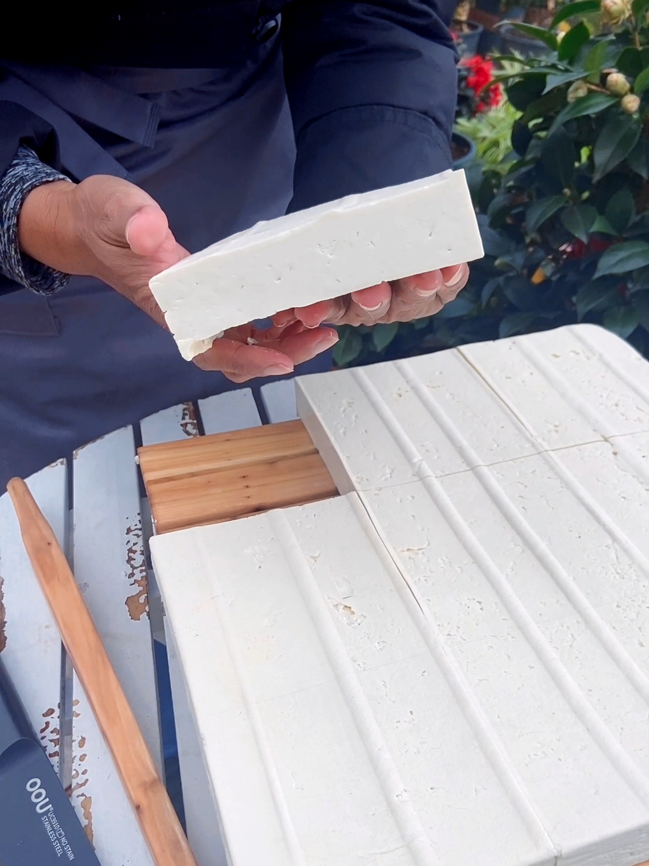 13、9添加卤水再慢慢添加卤水,慢慢搅动,卤水点多了,豆水发红,卤水少了,豆水发白,将提前泡好的豆腐包从水里拎出,不要挤水,到豆腐模具里,倒入豆腐花,好后压上重物10完成豆腐不滴水了,就可以拆包了拆包后的豆腐放在盖帘上,切成块,再沥干水分,豆腐就做好了。
