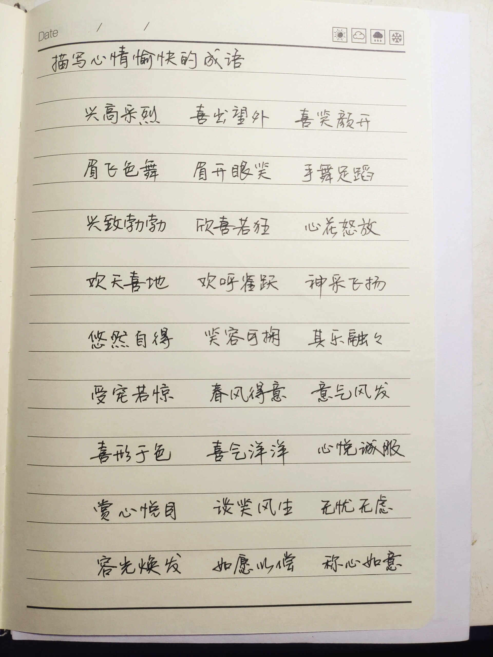 描写心情好的成语有多种,以下是一些常见的表达1 喜上眉梢 答案这个成语形容人高兴时,喜悦的神情自然而然地从眉眼上表现出来,是一种眉开眼笑的状态2 眉飞色舞 答案它用来描述人兴奋愉快时,表情生动地跃然脸上,显得非常兴奋和得意3 心满意足 答案此成语表示心中对某件事情或状态感到非常满意,没有遗憾或不满4 喜出望外 答案。