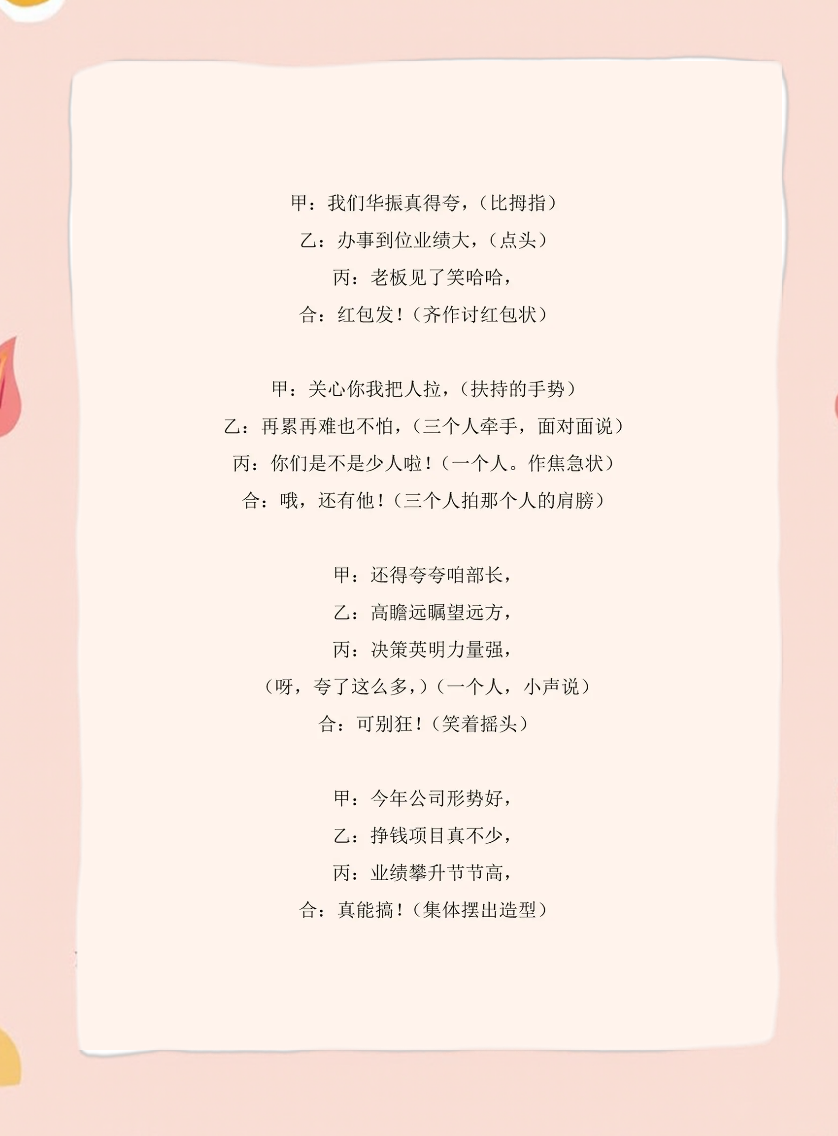 14、幼儿园年会三句半是一种轻松活泼的表演形式,通常由四位老师或家长配合完成前三人每人说一句完整的话,最后一人用半句点睛收尾,配合锣鼓节奏更佳以下是两个原创示例版本一童趣主题A小书包里装梦想B蹦蹦跳跳上学堂C橡皮铅笔交响曲D敲锣糖粘衣裳版本二成长主题A饭粒糊。