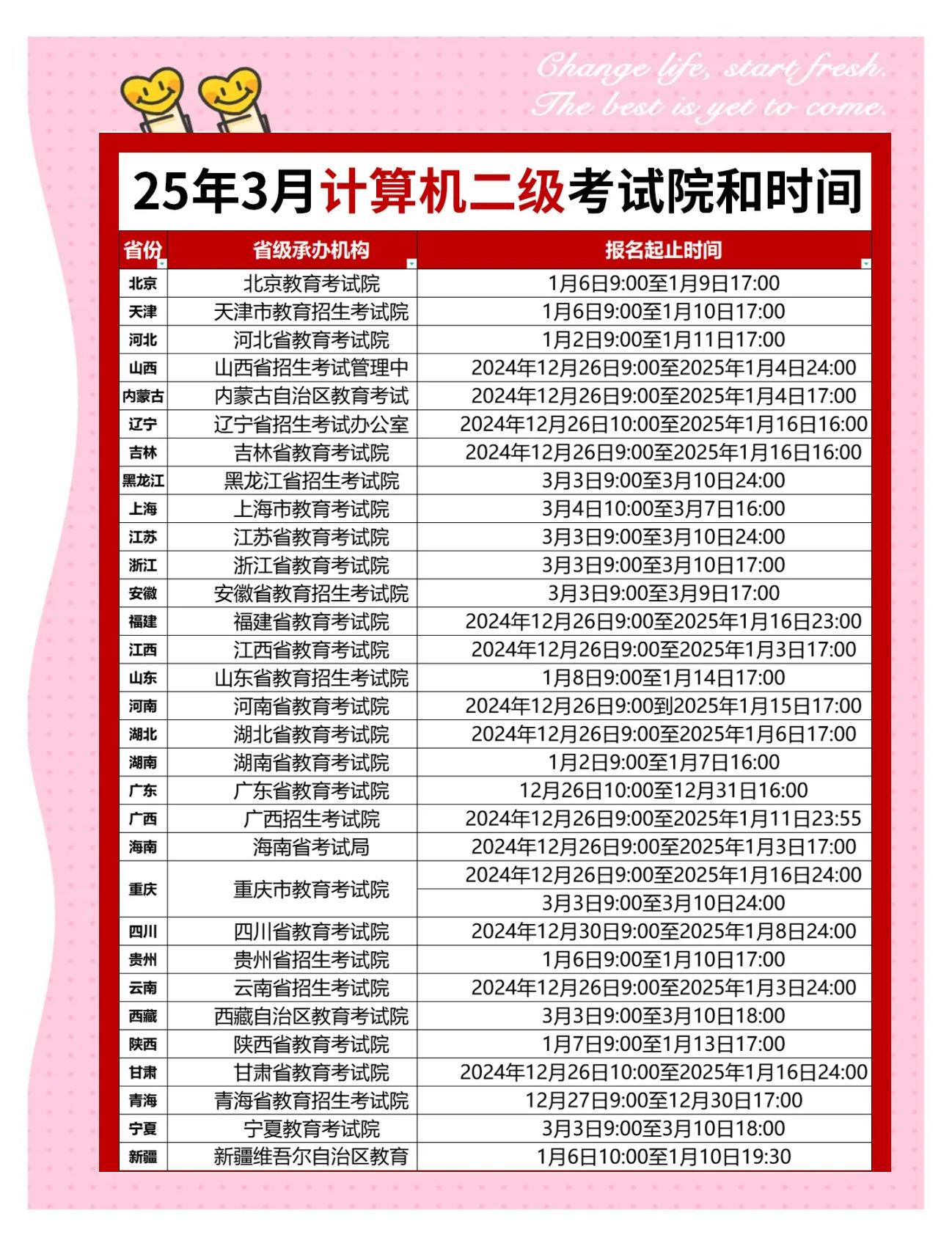 2025年9月全国计算机二级考试报名时间最早的省份开始时间是6月26日,但各省报名时间有所区别关于全国计算机二级考试的报名时间,考生需注意以下几点报名时间差异由于各省份的考试组织和准备工作存在差异,因此报名时间并不统一有的省份可能会提前开始报名,而有的省份则可能会稍晚一些考生需根据自己所在省份的。