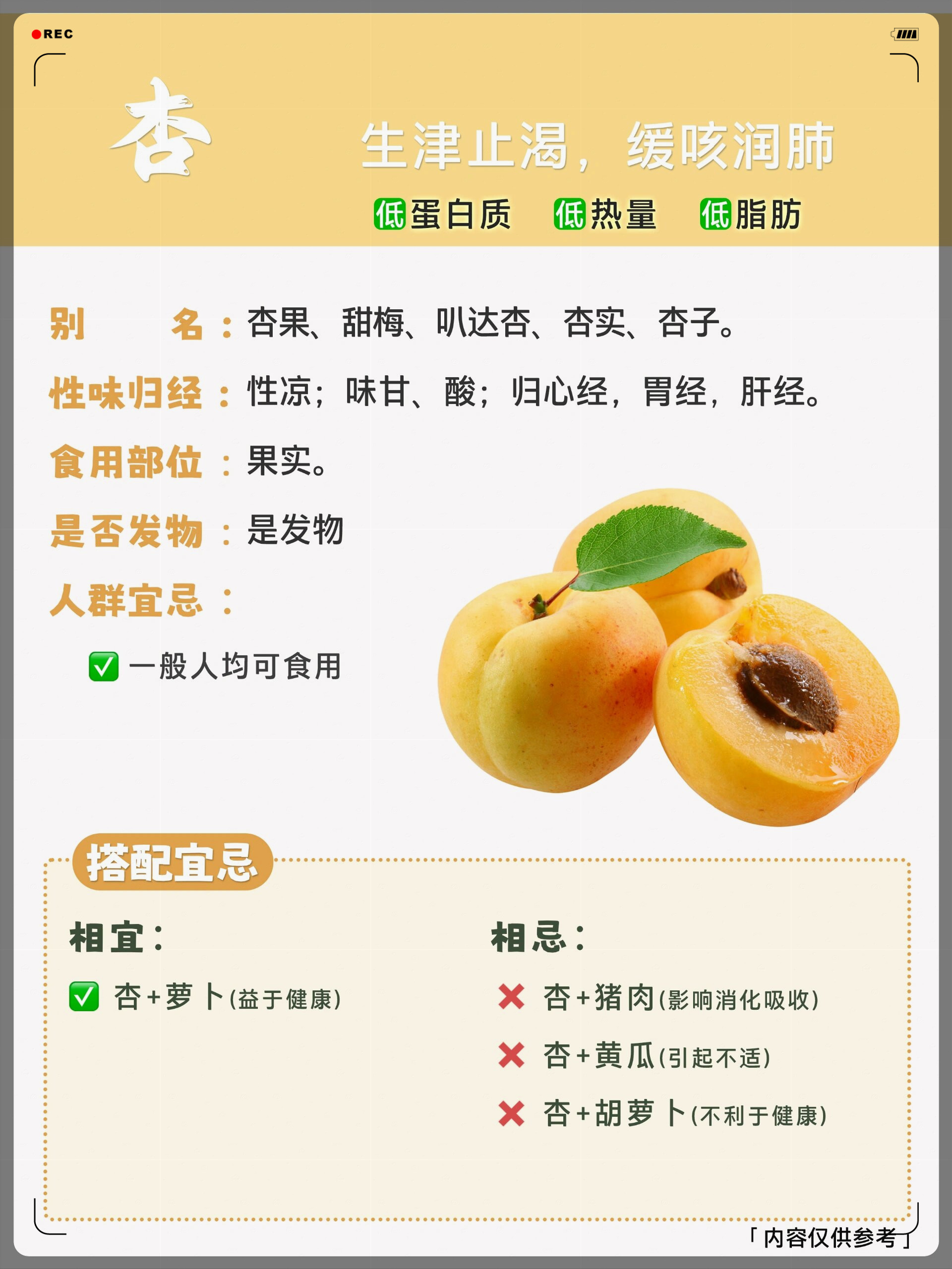 4、杏的功效与作用及食用方法如下功效与作用1 止咳平喘杏子被肠道分解后能产生少量的“氢氰酸”,该物质对呼吸中枢神经有镇定作用,从而起到止咳平喘的效果2 美容养颜杏子富含营养成分,如维生素等,无论内服或外用都能有效缓解皮肤衰老,保持肌肤的润滑弹性3 减肥杏子含有的不饱和脂肪酸不;四杏干能天天吃吗 杏干对人体健康有益,但最好不要每天食用,以免适得其反五杏干的保存 成品的杏干保存时需适当通风防潮食用前应至少用水冲洗两遍,以确保卫生六杏干的功效与作用及食用方法续 1 预防癌症杏干中的维生素B17具有抗氧化能力和抗癌能力,降低癌症发病率;一功效与作用1润肠通便杏子富含膳食纤维,能促进肠道蠕动,增加粪便体积,缩短排便时间大便不畅者适量食用可改善便秘问题,但需避免过量导致腹泻2增强体质杏子含有钙磷钾等矿物质及B族维生素,能补充人体必需营养素,维持代谢平衡,对增强免疫力预防营养不良有积极作用3美容养颜。