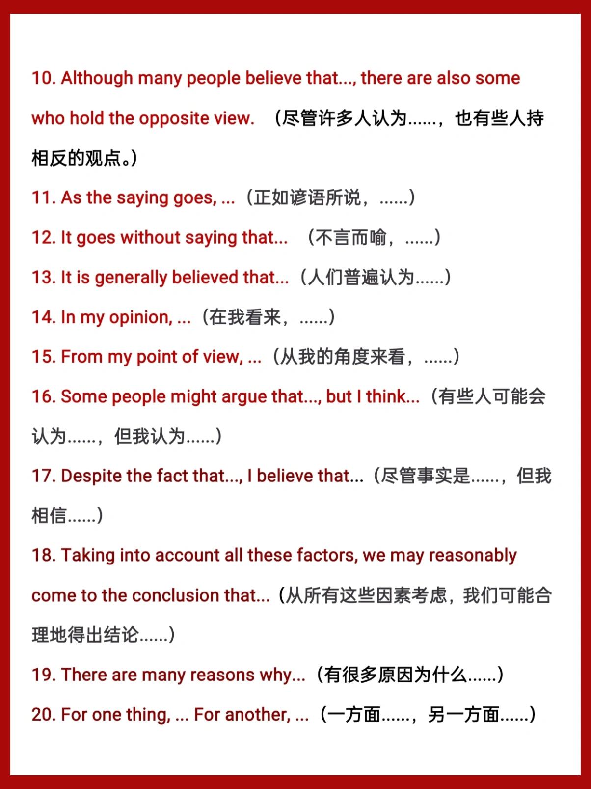2 Along with the steady growth in the country#39s economy as well as the people#39s living standard, people attach more importance to XX随着中国经济的稳步增长与人民去活水平的提高,人们越来走注重xx开头句型 1 As far asis concerned 就而言 far as I am concerned;英语四级作文万能模板和常用句型段首句中间句结尾句,段首句关于人们有不同的观点一些人认为There are different opinions among people as to ___ Some people suggest that ___用于作文开头的万能模板 1Many people insist that 很多人坚持认为这句话乍看没亮点;任何题目都可以套的万能作文英语模板如下一段首句 1关于XX人们有不同的观点一些人认为XXThere are different opinions among people as to XX Some people suggest that XX2俗话说常言道XX,它是我们前辈的经历,但是,即使在今天,它在许多场合仍然适用There is an old。