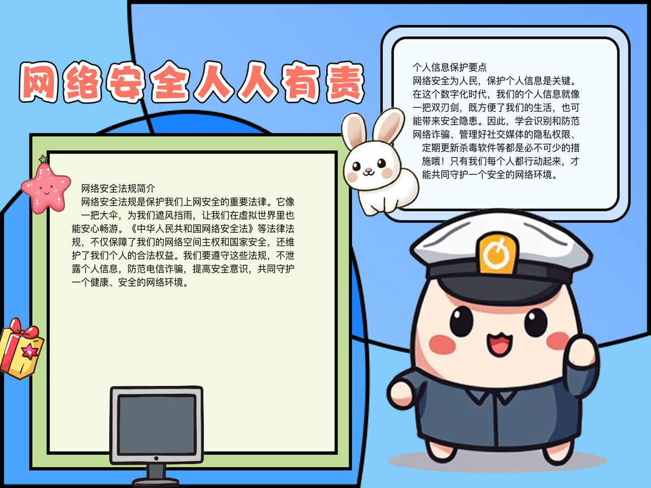 5、10 网络安全是天下的安全,一旦网络安全受损,整个社会都将受到影响以下是一些网络安全手抄报的内容 不要未经父母同意,在网上透露自己和家人的真实信息 看到不文明的网络信息应立即告知父母 不在聊天室或BBS上发布攻击性言论,不传播违反行为规范的内容 不要随意在网上公布自己的电子邮件。