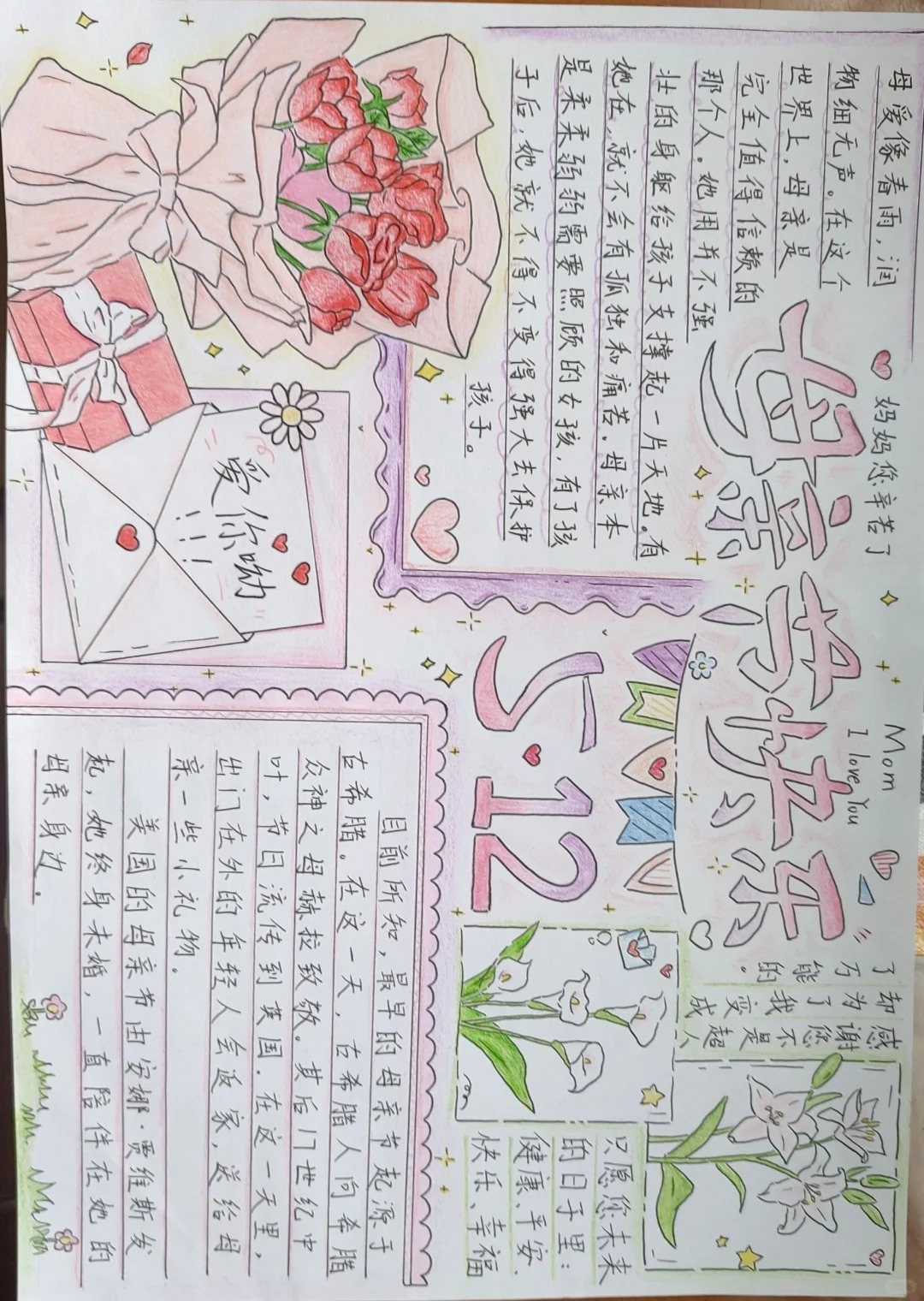 1母亲节是一个快乐难忘的节日,我是多么盼望它的到来啊2妈妈为了让我好好地成长,每到周末和寒暑假都为我报补习班东奔西跑,甚至今天仍然是为我的学习生活而操劳,结果那双脚都起了好几个水泡甚至都磨起了厚厚的茧子3今天,母亲节到了我决定为妈妈做一件事我要为母亲洗脚,洗去;感恩母亲节手抄报内容可以包括以下几点节日介绍母亲节简介母亲节是一个快乐且难忘的节日,专为庆祝和感激母亲们的辛勤付出和无私奉献而设立感恩事迹妈妈的辛劳妈妈为了孩子的成长,不辞辛劳地奔波,无论是周末还是寒暑假,都积极为孩子报补习班,操心孩子的学习生活,甚至因此双脚起了水泡,磨出。