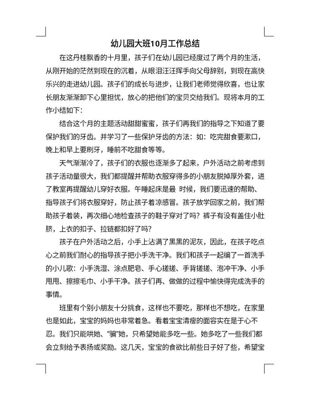 幼儿园大班个人工作总结完整版1 在孩子们的欢声笑语中一学期就要结束了回想这学期的点点滴滴,颇感欣慰,孩子的每一点进步都倾注了老师的心血,当然更离不开家长对我们工作的支持和配合看着孩子们一张张活泼,可爱的笑脸,我觉得自己的付出并没有白费我深深地感到,教师的人生就是实实在在,就是默默无闻,就是;我严格遵守幼儿园的卫生制度,配合保育老师严抓幼儿的卫生情况,教育幼儿勤洗手勤剪指甲勤洗头勤更换衣物和袜子等提醒幼儿多喝水,培养幼儿良好的进餐习惯由于甲流疫情严峻,无论在进行活动时或是休息时,我都密切留意幼儿的身体状况,经常检查幼儿是否有发烧状况或其他不舒服的状况另外,针对现在的孩子大都是独;每天做好晨检药物登记午睡检查等经过班级教师的共同配合下,幼儿的身体及将康都有得到很好的发展 四教师协作 各班教师在工作中能以班级利益为重,针对班级出现的问题大家都能及时沟通,教师间经常互相交流,做到了相互学习,及时反思,随时调整班级工作得以顺利进行 幼儿园大班学期个人工作总结3 在孩子们;大班个人工作总结2 幼儿期的思想品德教育能够为人一生打下坚实的基础,而大班幼儿正处于学期晚期,是由学期教育过渡到小学教育的承上启下的时期,所以,我们抓住这一重要时期,培养幼儿诚实有礼敢作敢为谦让合作关心他人的优良品德,养成良好的礼貌习惯,陶冶幼儿情操,培养幼儿的团体主义精神,为幼儿进入小学打下良好。