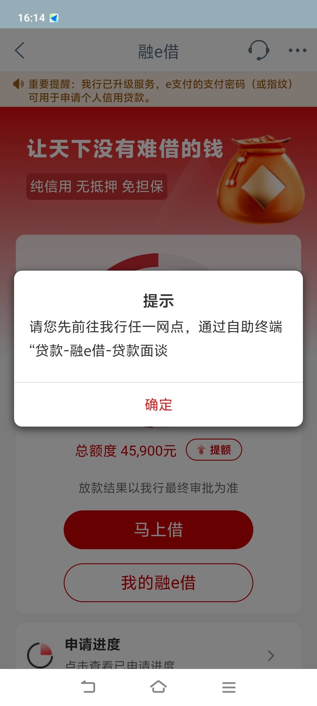 2、融e借有额度但借不出来,可能由以下原因导致1 个人征信记录存在问题银行在审批贷款时,会重点核查申请人的征信记录若征信报告中存在逾期还款呆账代偿等不良记录,或近期征信查询次数过多如频繁申请信用卡贷款,银行会认为申请人信用风险较高,从而拒绝放款即使已有授信额度,征信问题仍可能;1个人征信存在不良记录融e借作为工商银行推出的无担保无抵押信用贷款,对申请人征信要求严格若申请人在申请前存在贷款逾期未还信用卡透支未结清等违约行为,或近期频繁申请其他信贷产品导致征信查询次数过多,系统会判定其信用风险较高,即使有可用额度也会因信用和履约能力不足被拒贷此外,若存在;有时候,并不是个人原因导致额度提不出来,可能是工商自身贷款额度不足,这样会导致大部分用户无法提现遇到这种情况,个人资质再好信用再佳也没用,不可能提现出来三有销卡行为 回想一下,是不是有信用卡tx销卡等行为这样会影响你申请融e借,一旦有这些违规行为,会立马被拉进银行灰名单;工商银行融e借有额度借不出来工商银行融E借有额度却借出来的话,很可能是由于以下几点原因 1客户信用不好,可能近期给名下信用贷款产品还款时逾期了,导致信用受损,征信报告里记录有不良信息 2近期频繁贷款,且不少贷款未还,导致出现多头贷款情况个人负债率过高,工商银行因此担心客户经济收入情况不借还款能;工商银行融e借有额度却无法借出的主要原因如下1 工行额度不足工商银行融e借的贷款资金来源于银行自身的信贷池若银行当前信贷资源紧张,或针对特定时期的资金分配策略调整,可能导致即使个人账户显示有可用额度,实际放款时因总额度不足而失败这种情况通常与银行整体流动性管理相关,而非个人资质问题2;之前可以用融e借现在有额度却借不了,可能是因为存在违规操作或不符合当前借款条件以下是可能导致这种情况的几个原因及解释一违规操作 资金用途违规如果之前使用融e借的贷款资金直接用于偿还其他银行的贷款,这被视为违规操作银行通常规定贷款资金不得用于偿还其他债务,尤其是非本行的债务此类;工行融e借有额度拿不出来怎么办首先,需要明确的是,工行融e借的额度与工行信用卡额度是共享的即便没有工行信用卡,只要有储蓄卡也可以申请融e借然而,有时申请人可能会遇到有额度但无法借款的情况,这通常与以下几个因素有关1 负债高 原因申请人的负债比较高,超过了银行风控标准,导致再次。