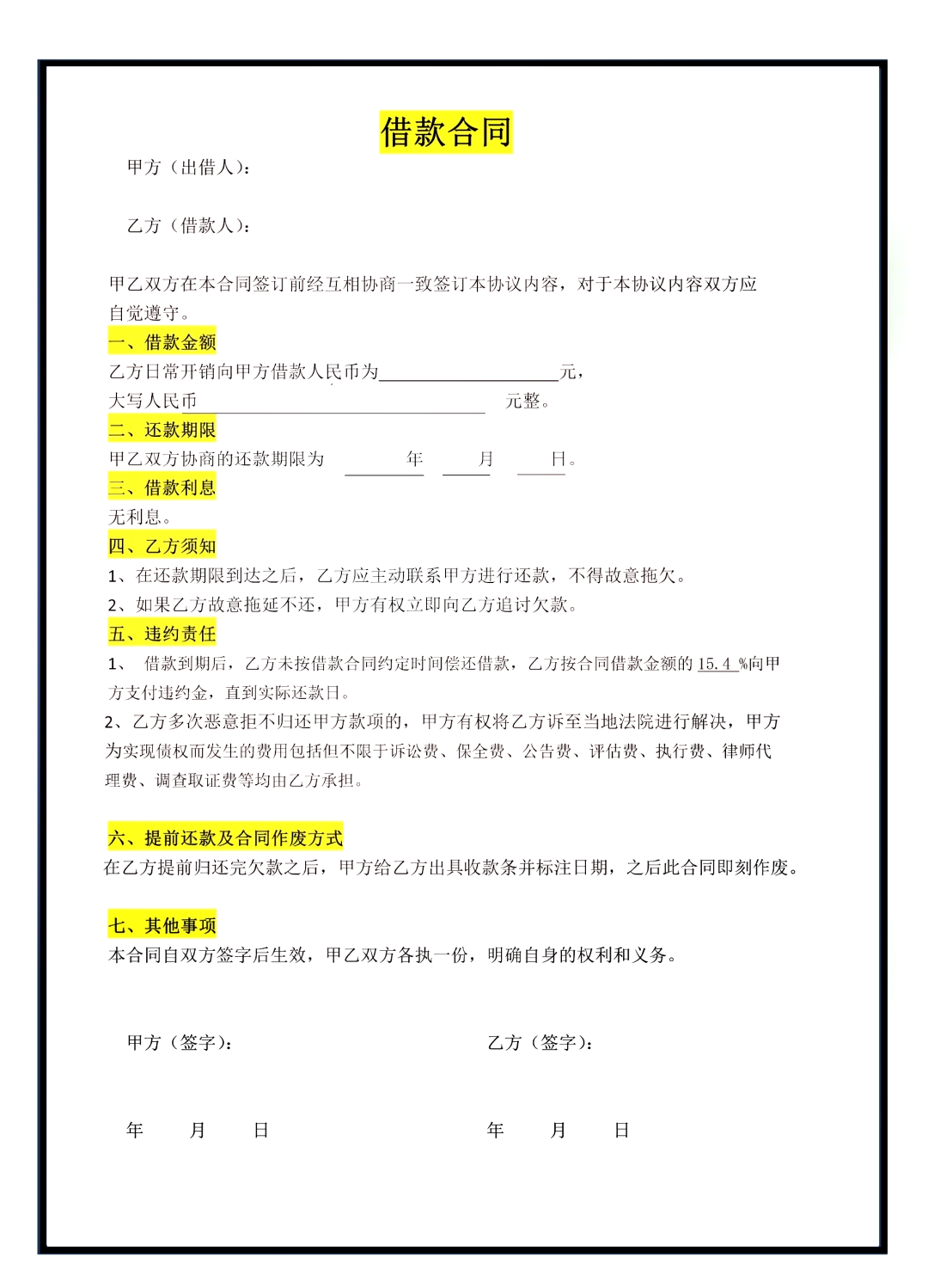 1、甲方公章___ 乙方公章___法定代表人签字___ 法定代表人签字___年___月___日 ___年___月___日个人借款合同范本模板篇二甲方___乙方___丙方___甲乙丙三方经自愿平等协商,达成如下协议一乙方向甲方借款人民币___元整___元用于向甲方支付下;个人向个人借款合同范本如下一合同基本信息 甲方需填写姓名民族身份证号码 乙方需填写姓名民族身份证号码二借款目的与用途 本合同借款主要用于甲方指定事项,未经乙方同意,不得改变借款用途三借款金额与期限 借款金额需明确填写人民币小写金额及大写金额 借款期限需明确填写;我也去答题访问个人页 关注 展开全部 借款合同 是当事人约定一方将一定种类和数额的货币所有权移转给他方,他方于一定期限内返还同种类同数额货币的合同,即借款人向贷款人借款,到期返还借款并支付利息的合同下面是我为大家带来的正规个人借款合同模板范本_2021借款 合同范本 ,欢迎大家查阅! 借款合同范本1 甲方;如果没有约定利息,根据民法典规定,自然人之间的借款合同对支付利息没有约定或者约定不明确的,视为不支付利息公民之间的个人借款如果没有约定利息,就视为没有利息欠条,没有约定的,也是没有利息,但是过了还款日,没有还的,到时可以要求按银行利息计算利息5时间问题 在民间借贷中,容易产生争议的时间包括两点还款;个人借款合同范本如下一合同主体 甲方填写姓名 身份证号码填写身份证号码 乙方填写姓名 身份证号码填写身份证号码二借款条款 借款金额填写金额 借款用途借款人因具体需求急需一笔资金 借款月利率填写利率,按月收息 借款期限借款时间自起始年月日起至;借款协议书范本出借人甲方身份证号 借款人乙方身份证号 甲乙双方是在平等自愿友好地协商的基础上,达成了以下协议一乙方向甲方借款人民币___ 元整二借款期限为 ___年,从___ 年 ___月___ 日起至___ 年___ 月 ___日止三借款期限届满,乙方保证马上返还全部借款。