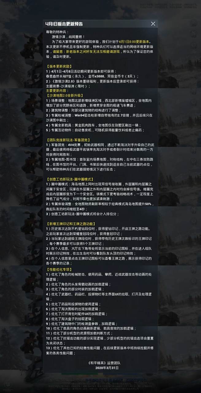 和平精英在2024年3月19号进行更新每隔三四个月,和平精英总会迎来一次大版本迭代更新,通常情况下,春节版本与周年庆典版本,往往都是最用心思的,所以会得到更多的玩家关注新版本全面升级组队大厅陪玩广告行为检测策略,进一步加强陪玩广告检测与识别效率新增组队大厅陪玩广告快捷举报功能玩家可。