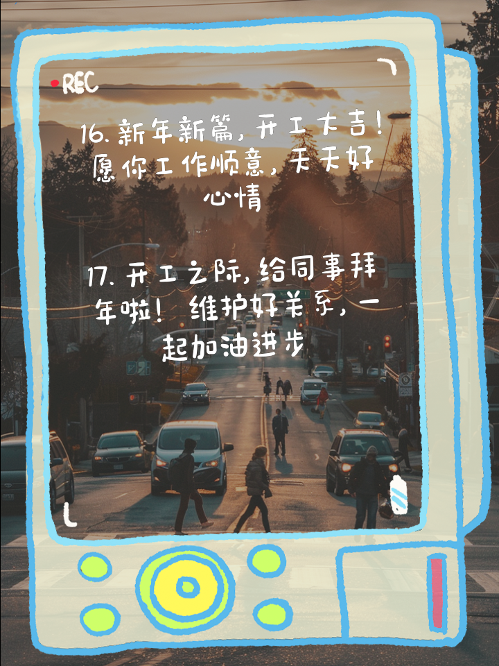 4、官方文案类1新年上班第一天,愿您工作顺利,万事如意2新年开工大吉,愿您事业蒸蒸日上,财源广进3新年新气象,愿您在工作中不断创新,取得更好的成绩4新年新起点,愿您以饱满的热情,迎接新的挑战5新年新希望,愿您在工作中收获满满,生活幸福6新年新开始,愿您事业有成。