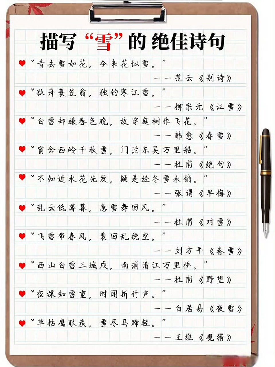诗句六出飞花四面来,连山连水皓皑皑描述四面飞雪,山水一片雪白,天地苍茫,园林中雪落枝头如花盛开,展现了雪景的壮丽与美丽咏雪诗句千片万片无数片,飞入梅花都不见描述描述了雪花纷飞融入梅花的景象,表现了雪与梅的相互映衬之美念奴娇·咏雪诗句广寒宫里,散天花点点。